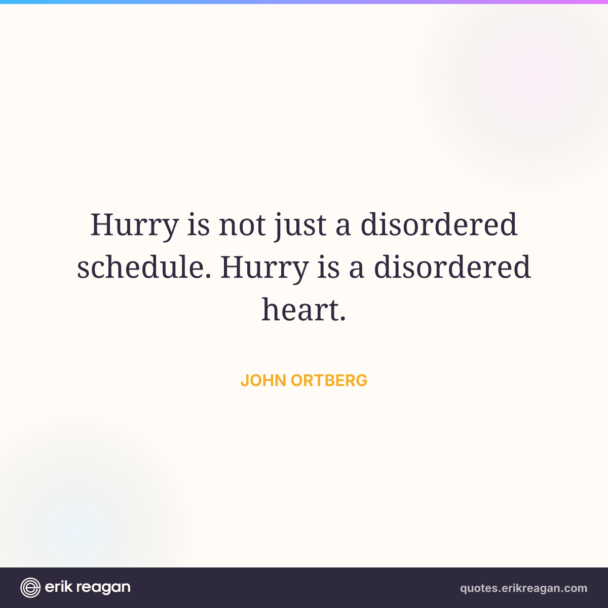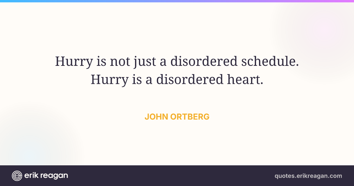 New New Random Quote | Copy Copy Quote Copy Link | Share Post on X Share on Facebook Share on LinkedIn Send via Email | Download Wide 1200×630 Square 1200×1200 Tall 900×1200 Hurry is not just a disordered schedule. Hurry is a disordered heart.