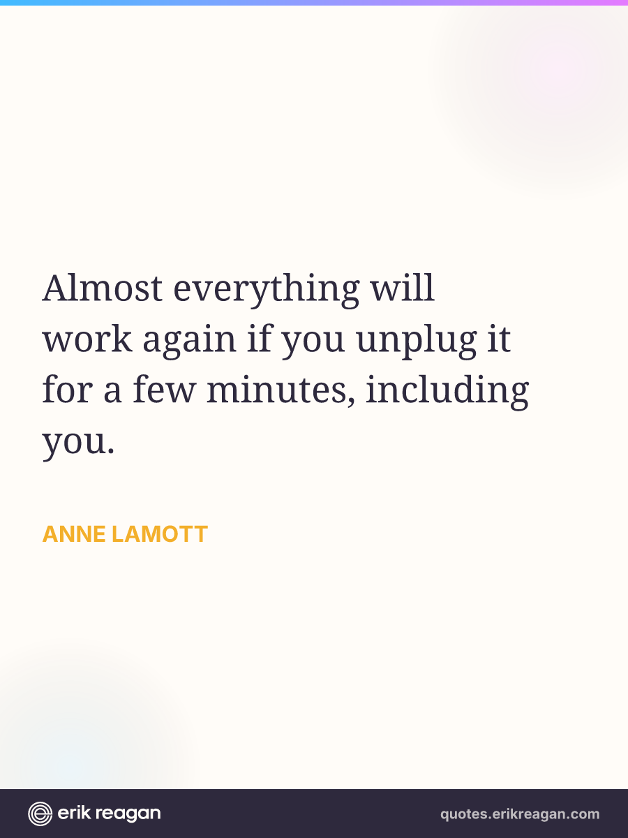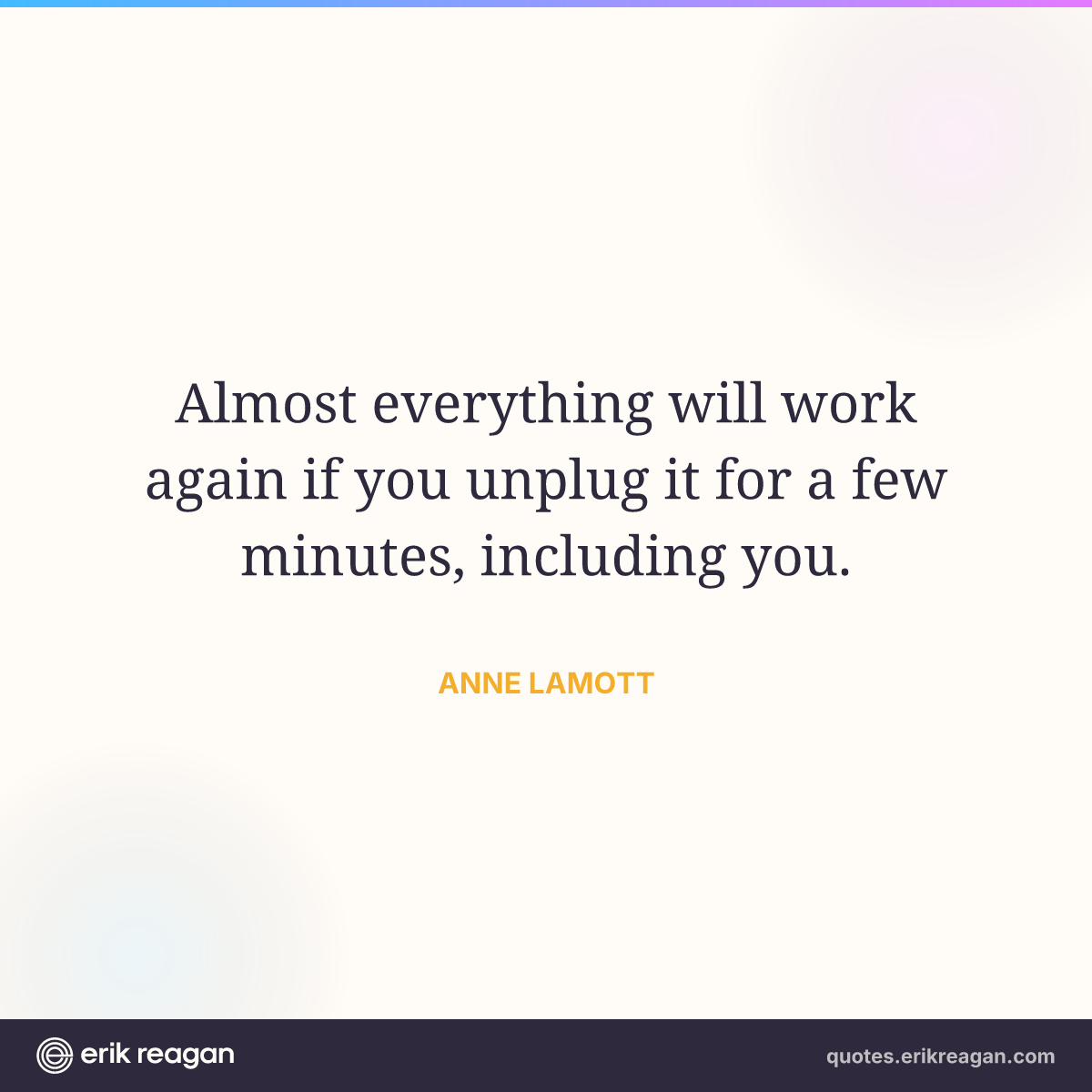 New New Random Quote | Share Post on X Share on Facebook Share on LinkedIn Send via Email | Copy Copy Quote Copy Link | Download Wide 1200×630 Square 1200×1200 Tall 900×1200 Almost everything will work again if you unplug it for a few minutes, including you.