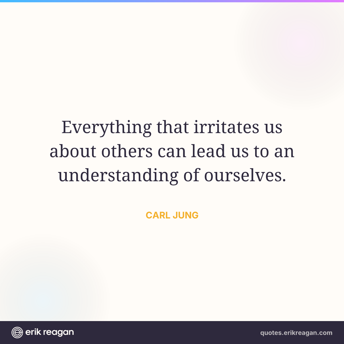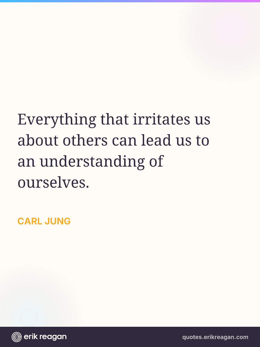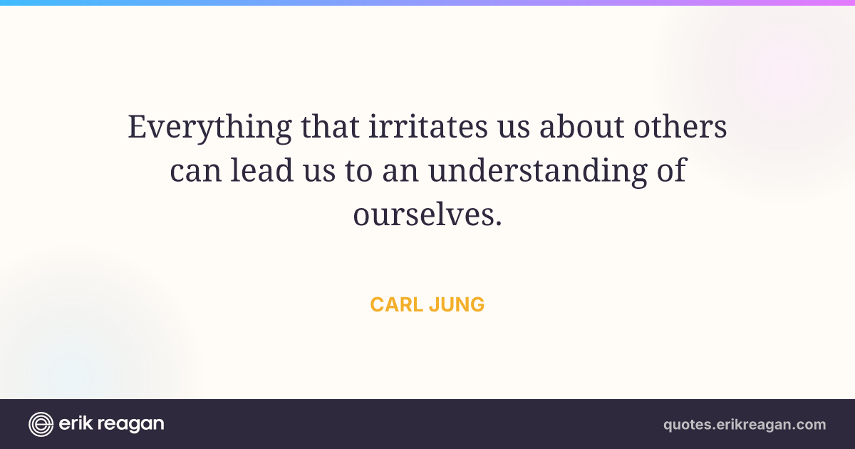 New New Random Quote | Share Post on X Share on Facebook Share on LinkedIn Send via Email | Copy Copy Quote Copy Link | Download Wide 1200×630 Square 1200×1200 Tall 900×1200 Everything that irritates us about others can lead us to an understanding of ourselves.