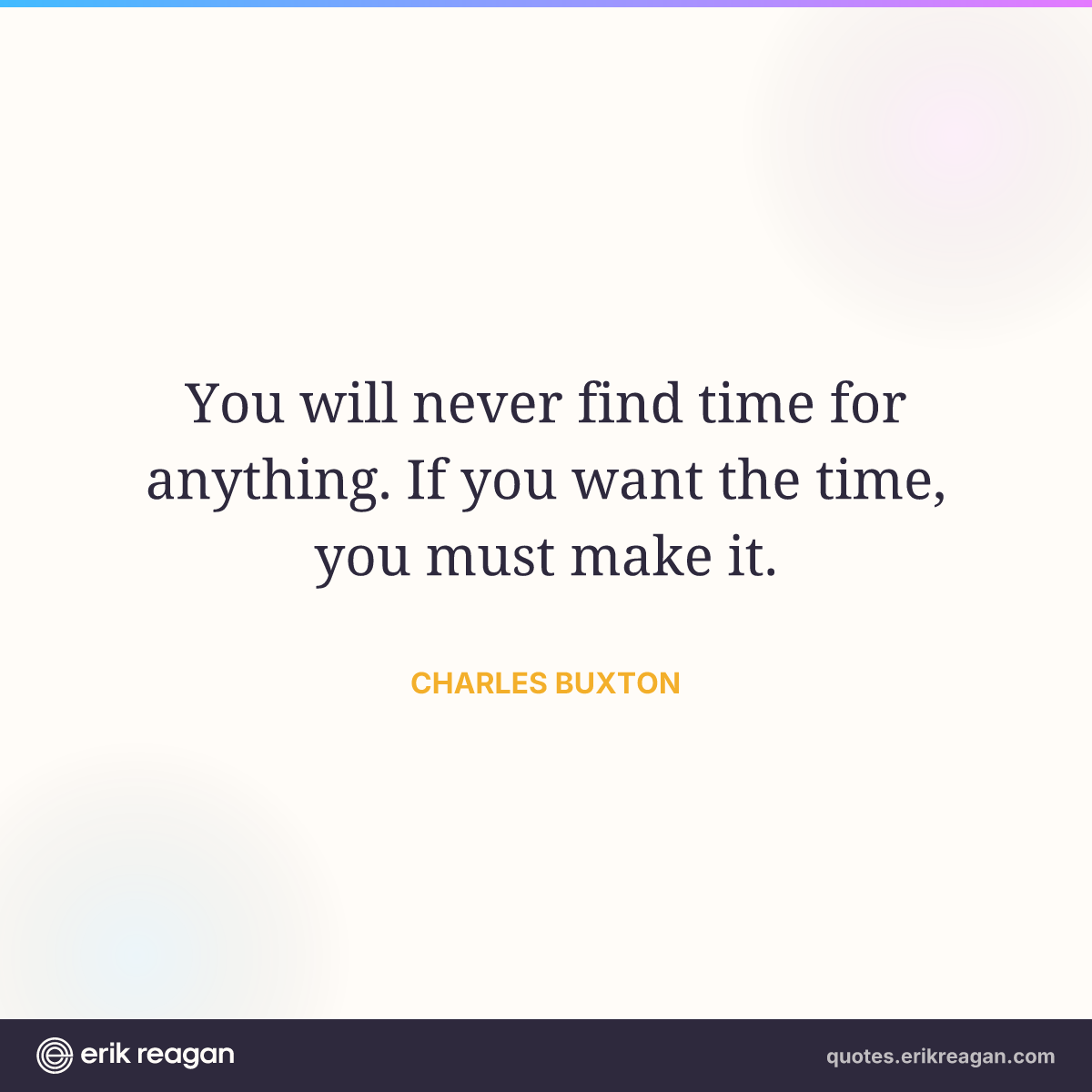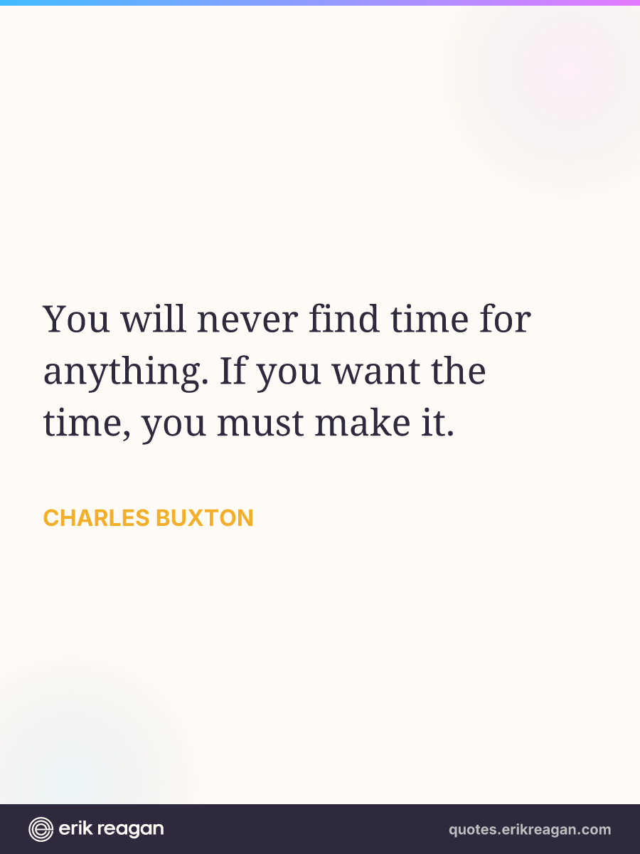 New New Random Quote | Share Post on X Share on Facebook Share on LinkedIn Send via Email | Copy Copy Quote Copy Link | Download Wide 1200×630 Square 1200×1200 Tall 900×1200 You will never find time for anything. If you want the time, you must make it.