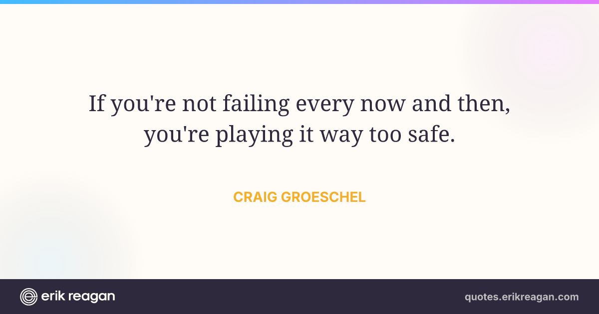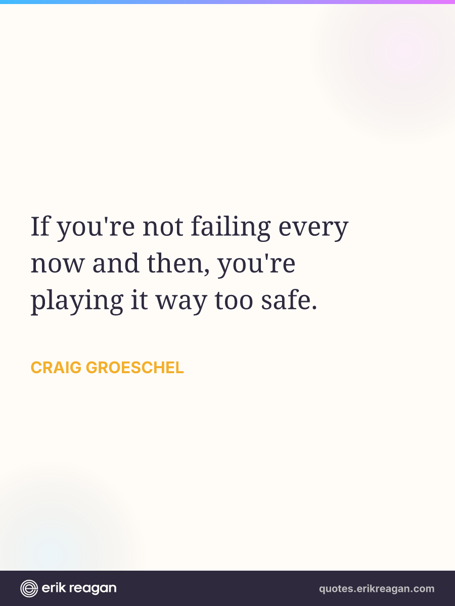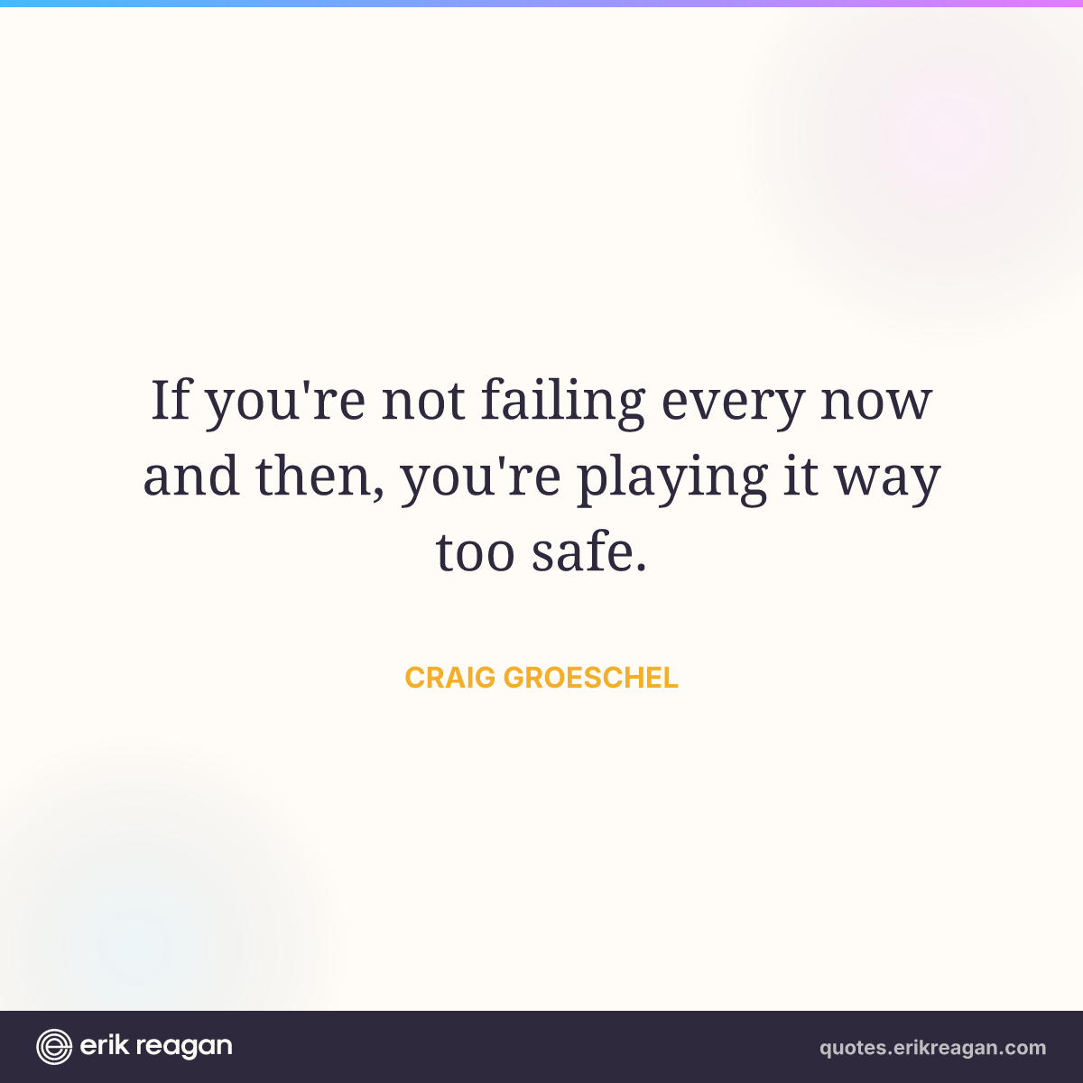 New New Random Quote | Share Post on X Share on Facebook Share on LinkedIn Send via Email | Copy Copy Quote Copy Link | Download Wide 1200×630 Square 1200×1200 Tall 900×1200 If you're not failing every now and then, you're playing it way too safe.