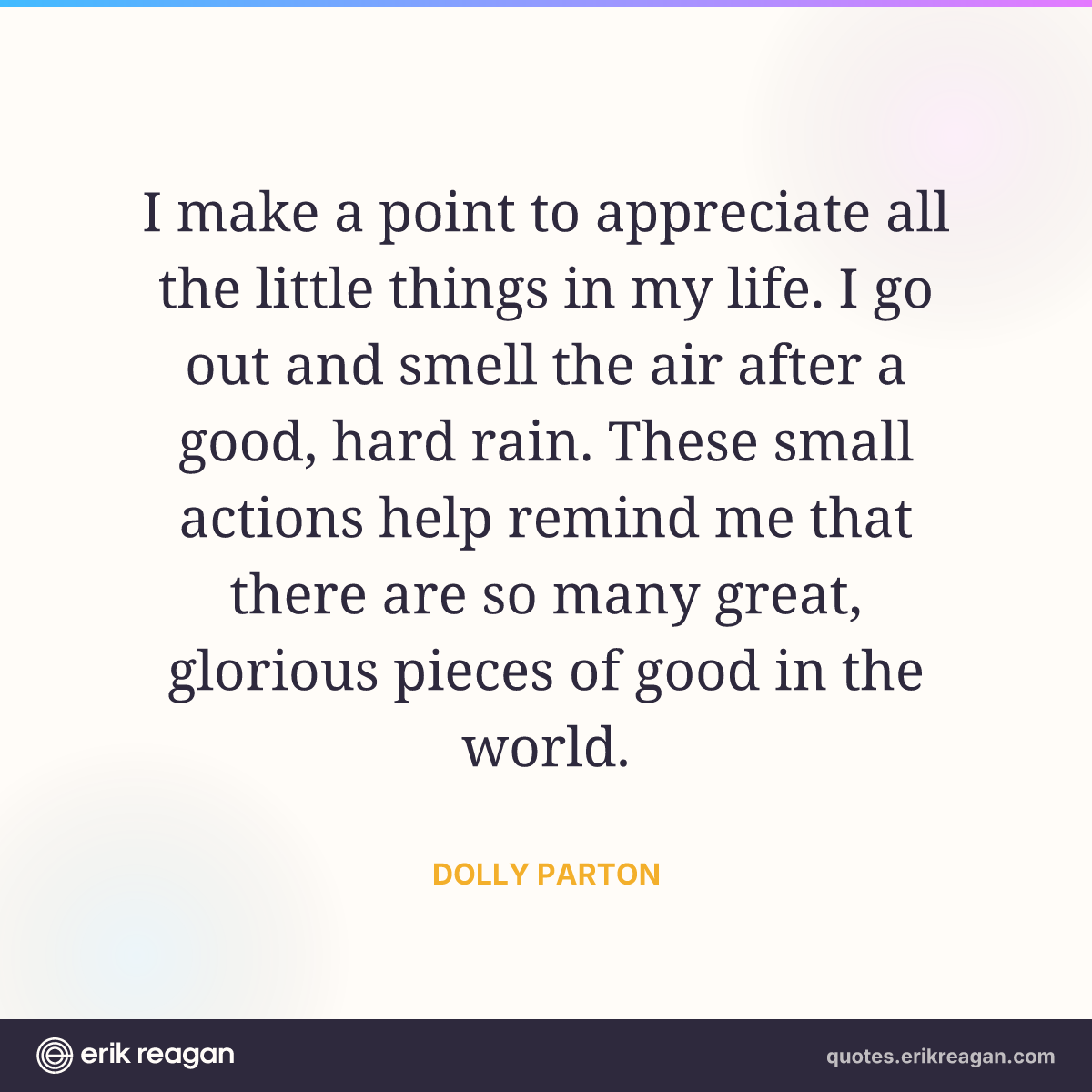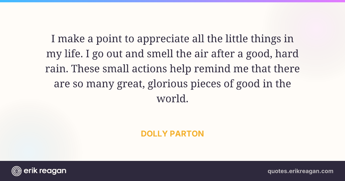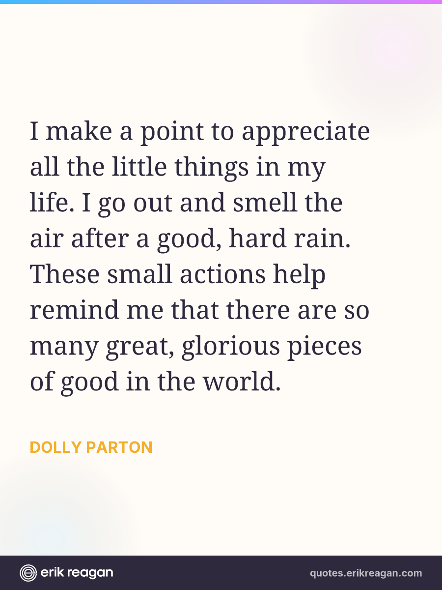 I make a point to appreciate all the little things in my life. I go out and smell the air after a good, hard rain. These small actions help remind me that there are so many great, glorious pieces of good in the world.