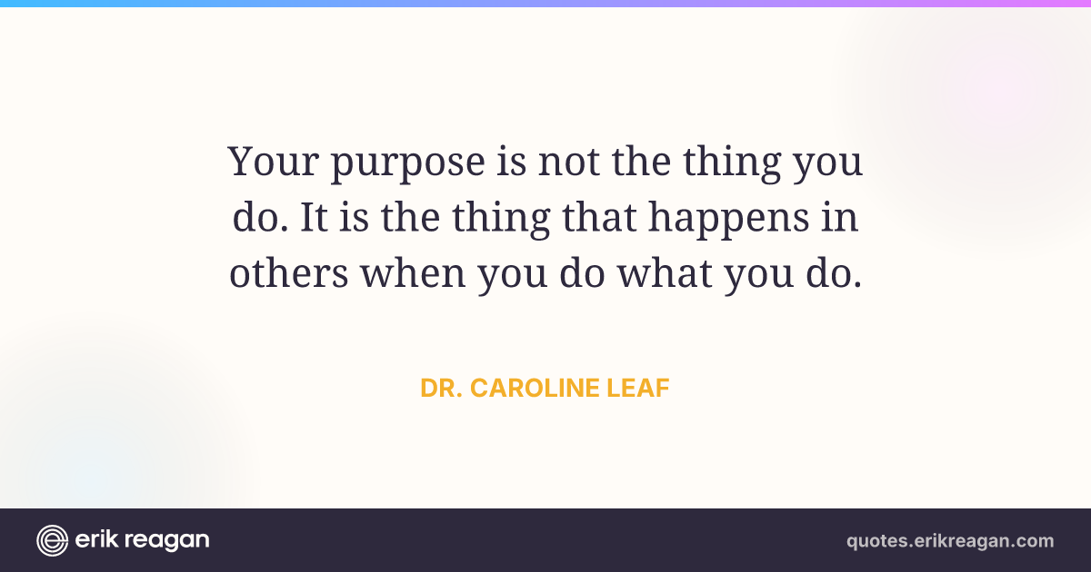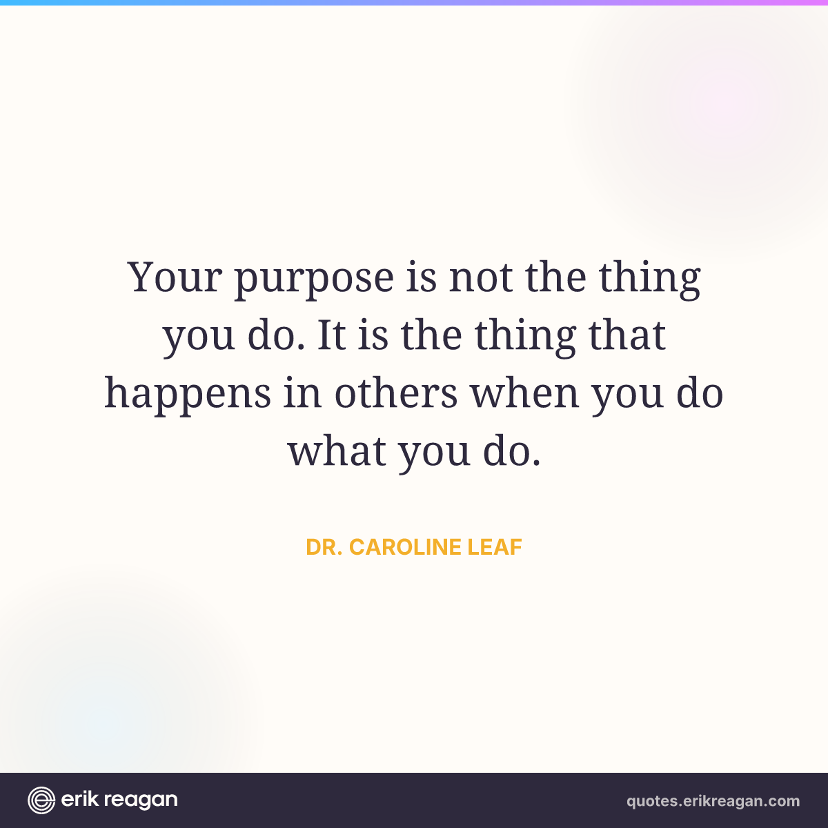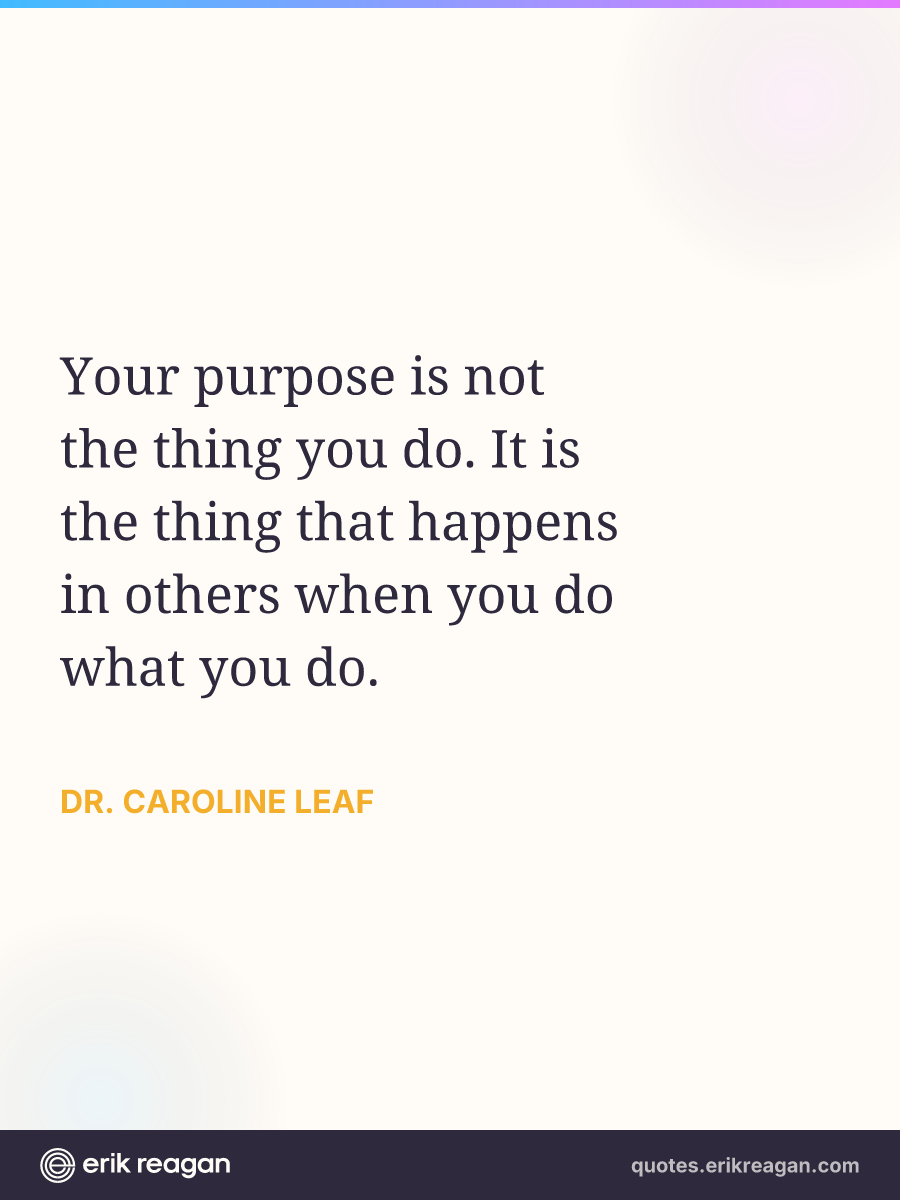New New Random Quote | Share Post on X Share on Facebook Share on LinkedIn Send via Email | Copy Copy Quote Copy Link | Download Wide 1200×630 Square 1200×1200 Tall 900×1200 Your purpose is not the thing you do. It is the thing that happens in others when you do what you do.
