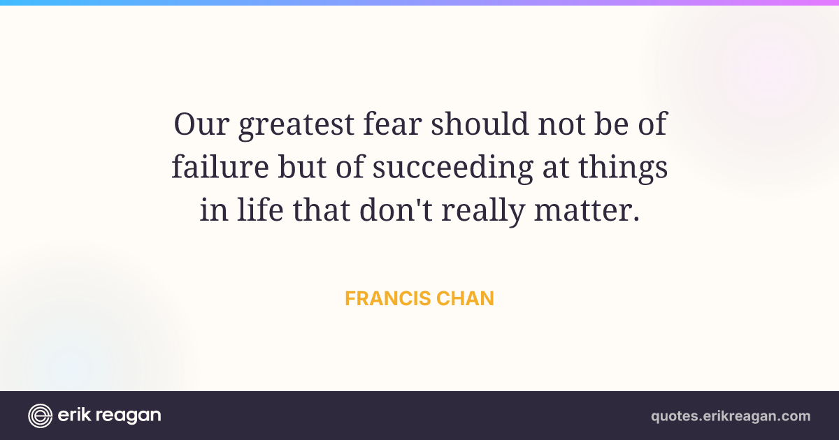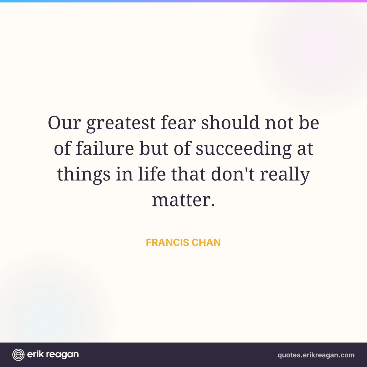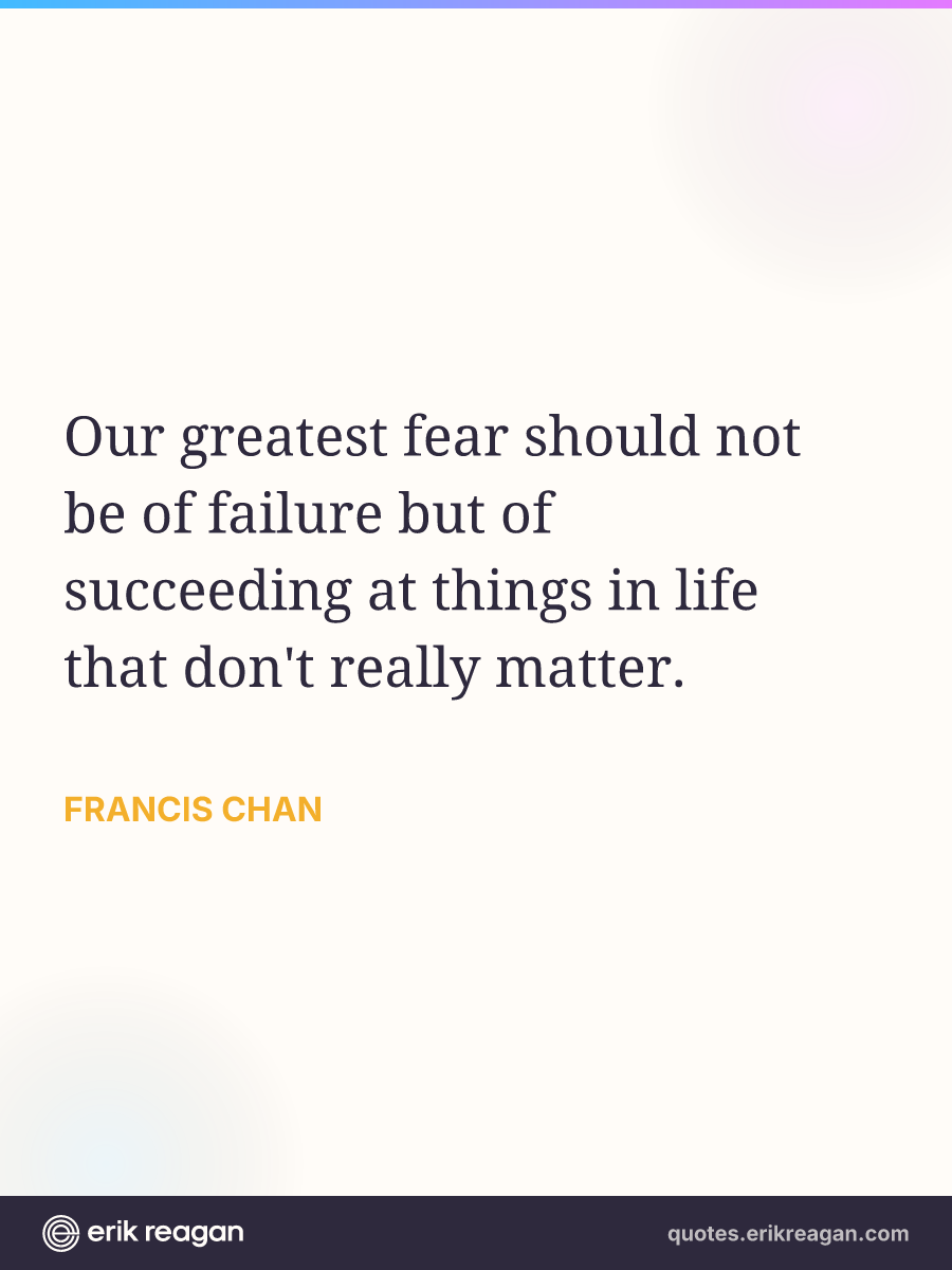 New New Random Quote | Share Post on X Share on Facebook Share on LinkedIn Send via Email | Copy Copy Quote Copy Link | Download Wide 1200×630 Square 1200×1200 Tall 900×1200 Our greatest fear should not be of failure but of succeeding at things in life that don't really matter.