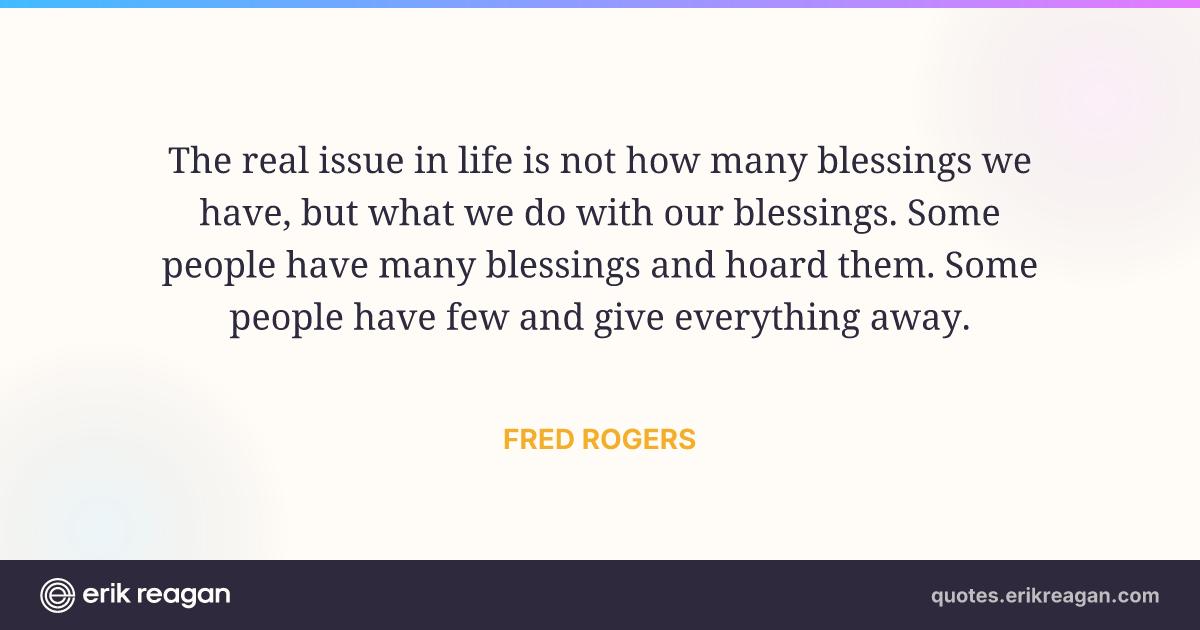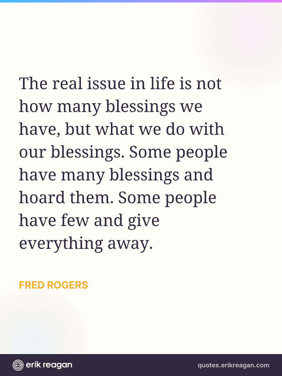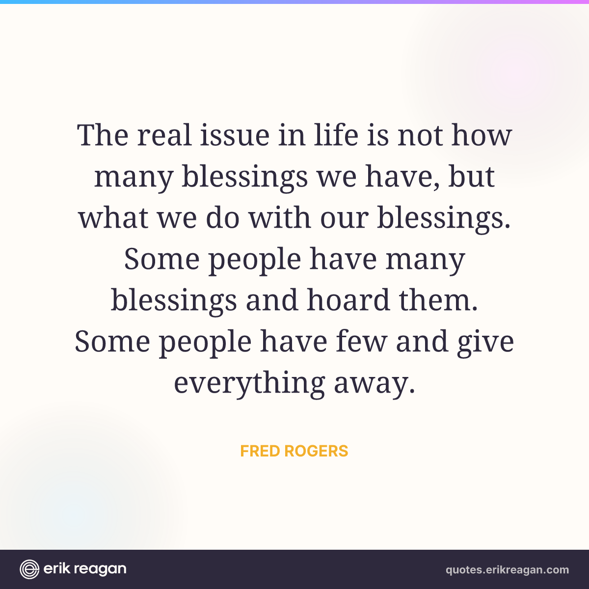 New New Random Quote | Share Post on X Share on Facebook Share on LinkedIn Send via Email | Copy Copy Quote Copy Link | Download Wide 1200×630 Square 1200×1200 Tall 900×1200 The real issue in life is not how many blessings we have, but what we do with our blessings. Some people have many blessings and hoard them. Some people have few and give everything away.