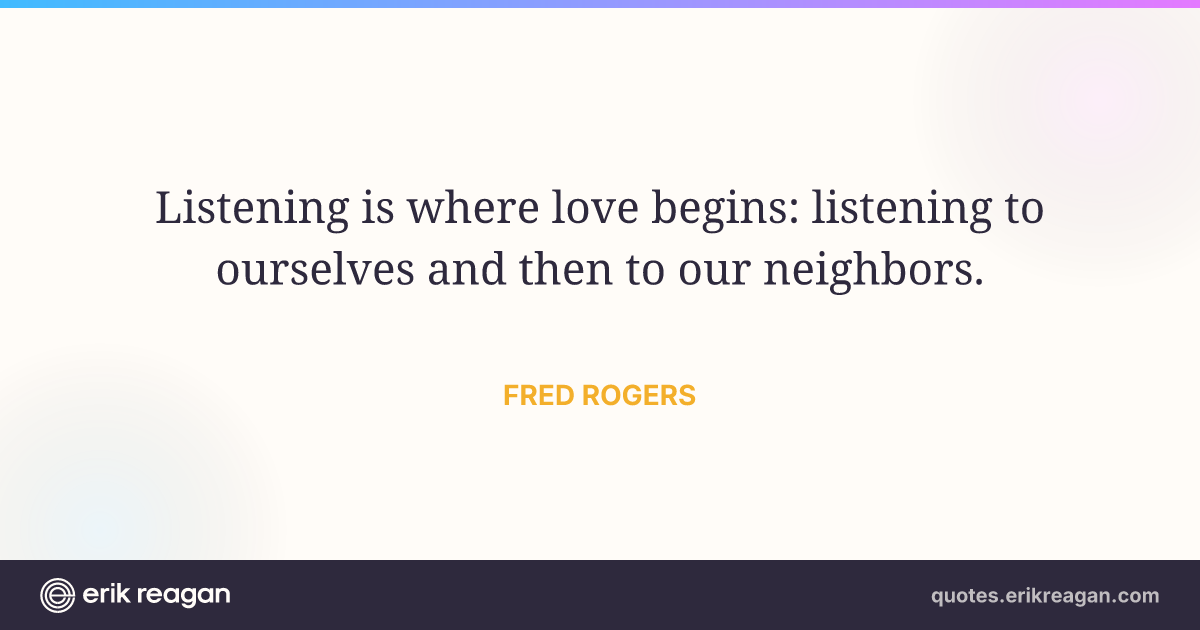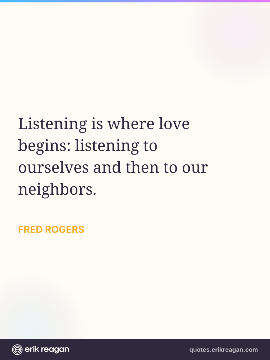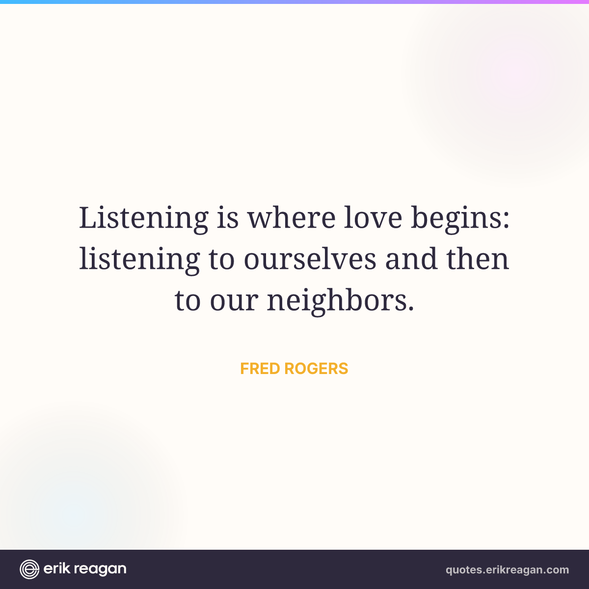 New New Random Quote | Share Post on X Share on Facebook Share on LinkedIn Send via Email | Copy Copy Quote Copy Link | Download Wide 1200×630 Square 1200×1200 Tall 900×1200 Listening is where love begins: listening to ourselves and then to our neighbors.