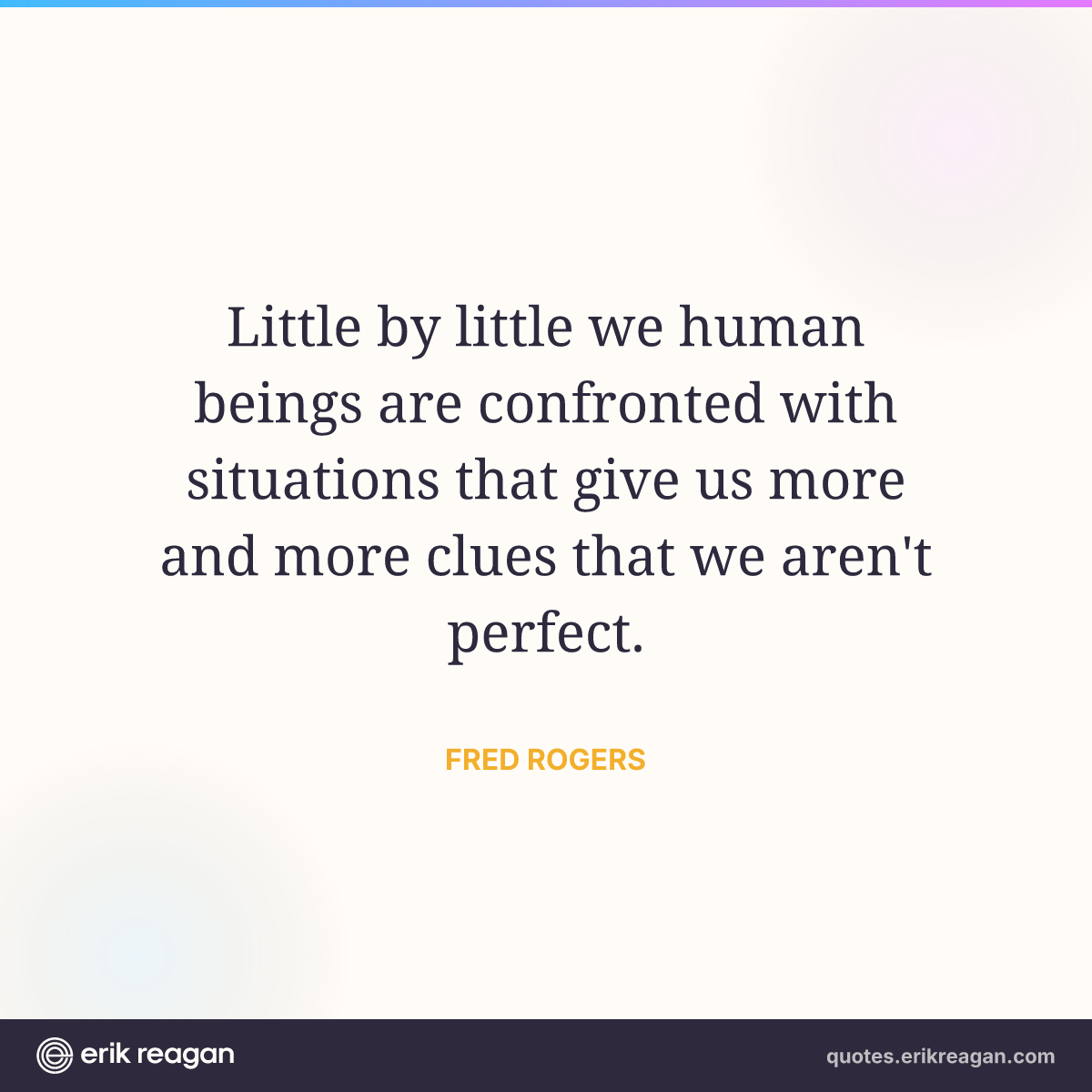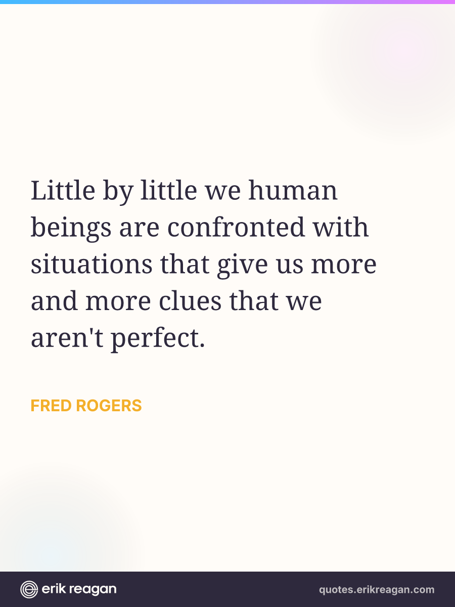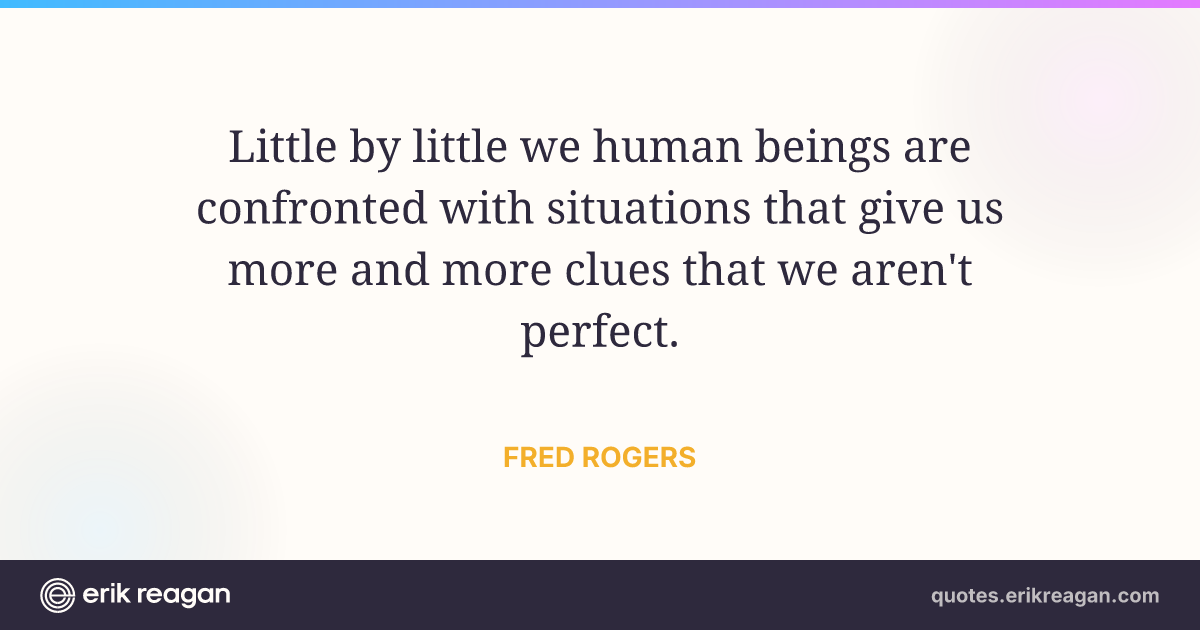 New New Random Quote | Share Post on X Share on Facebook Share on LinkedIn Send via Email | Copy Copy Quote Copy Link | Download Wide 1200×630 Square 1200×1200 Tall 900×1200 Little by little we human beings are confronted with situations that give us more and more clues that we aren't perfect.