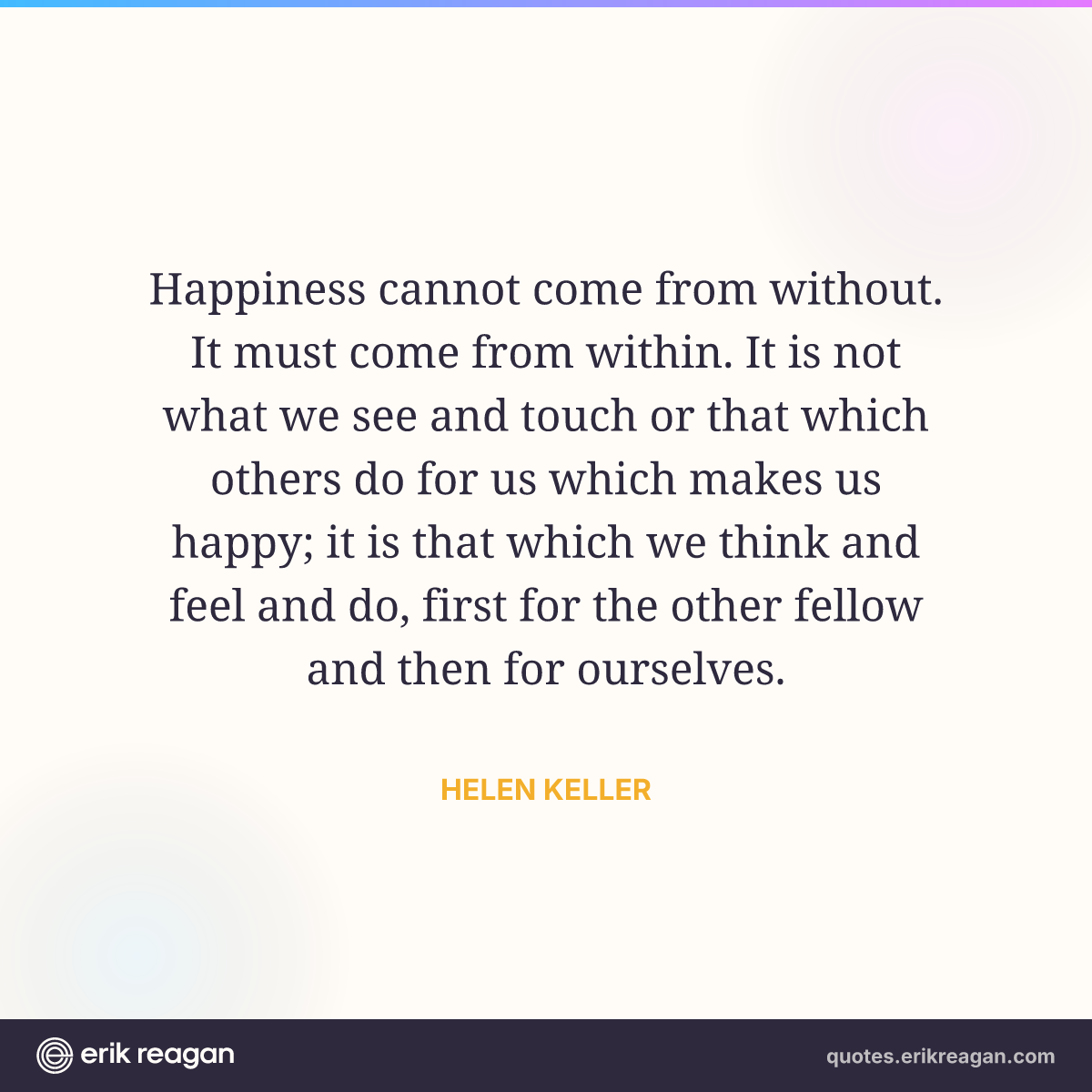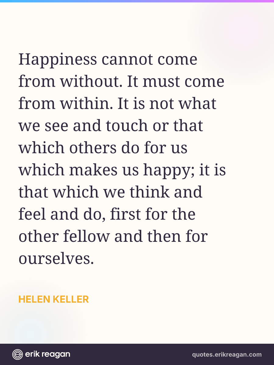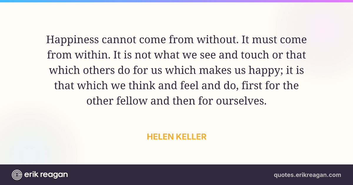 Happiness cannot come from without. It must come from within. It is not what we see and touch or that which others do for us which makes us happy; it is that which we think and feel and do, first for the other fellow and then for ourselves.