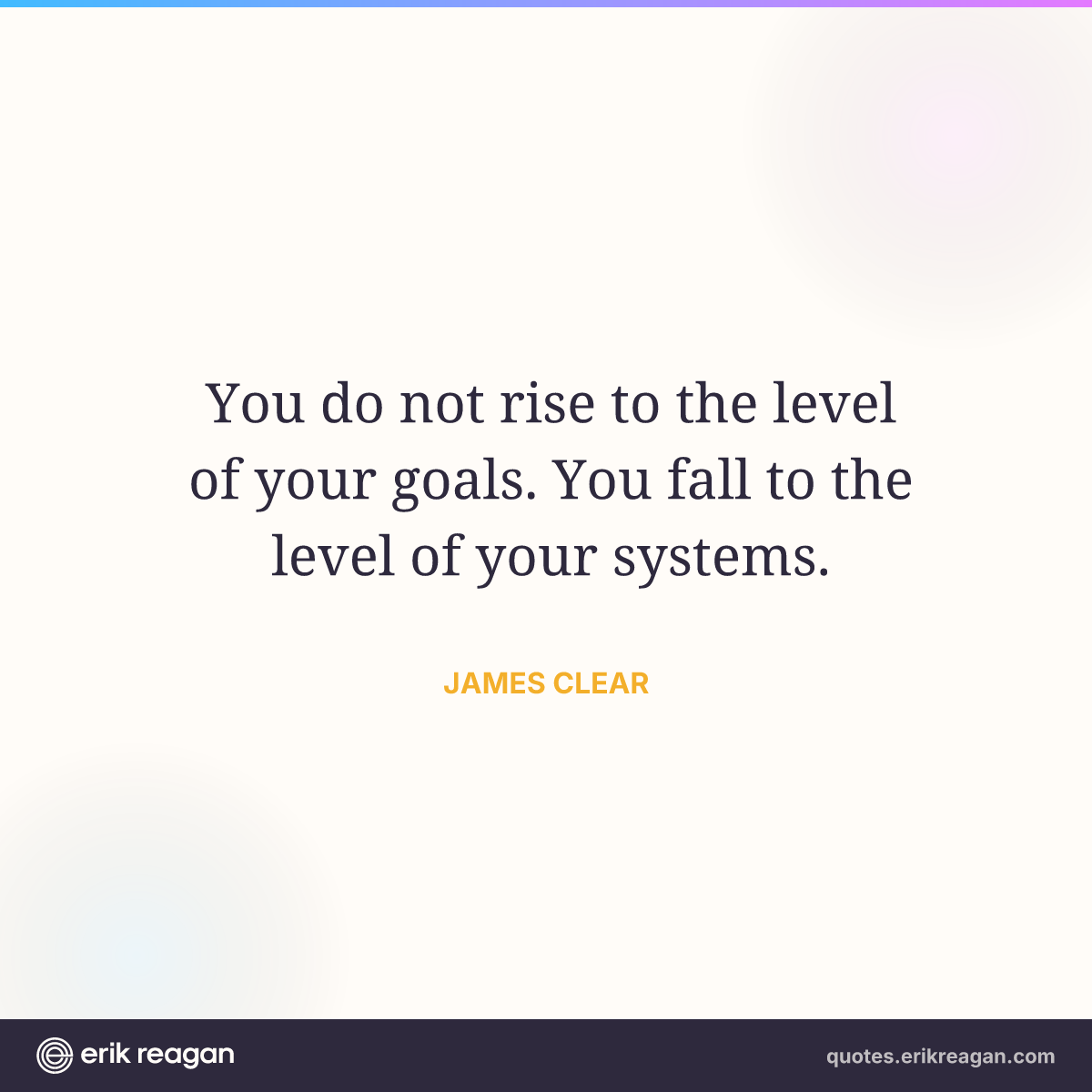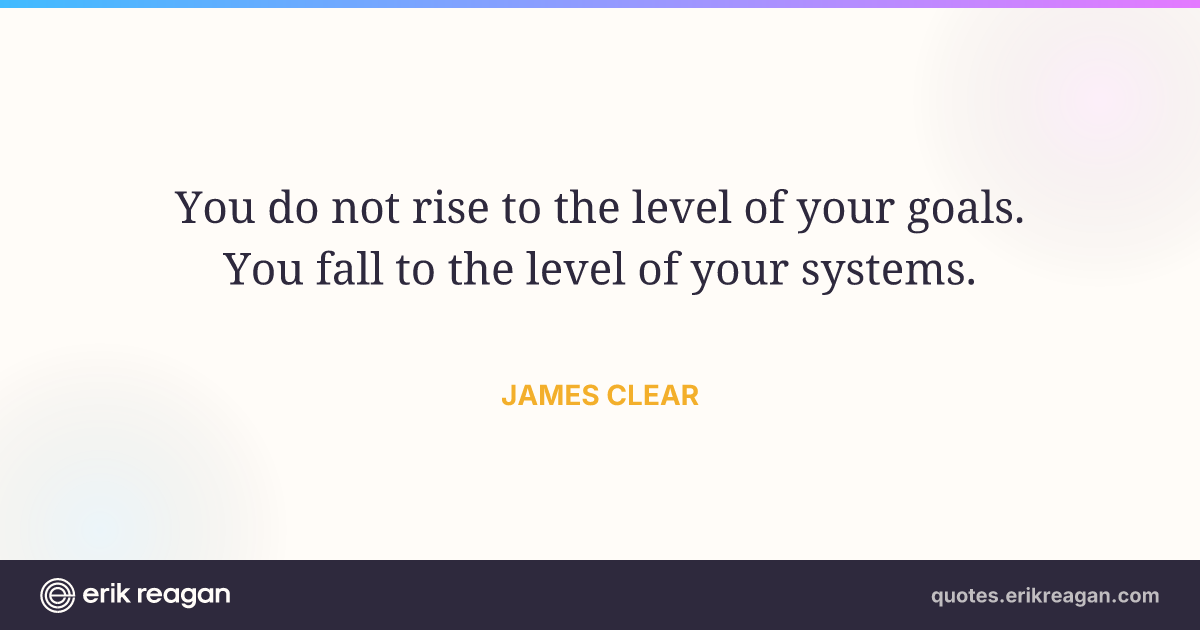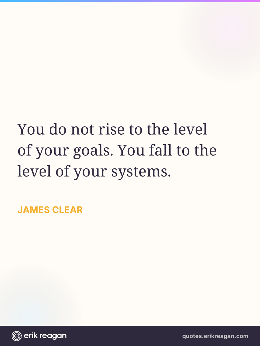 New New Random Quote | Share Post on X Share on Facebook Share on LinkedIn Send via Email | Copy Copy Quote Copy Link | Download Wide 1200×630 Square 1200×1200 Tall 900×1200 You do not rise to the level of your goals. You fall to the level of your systems.