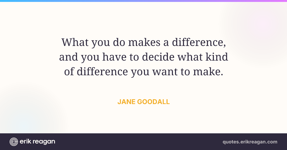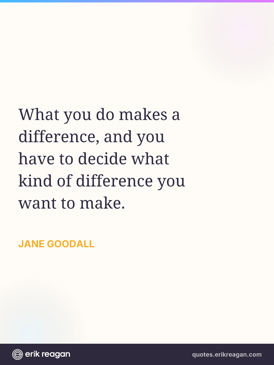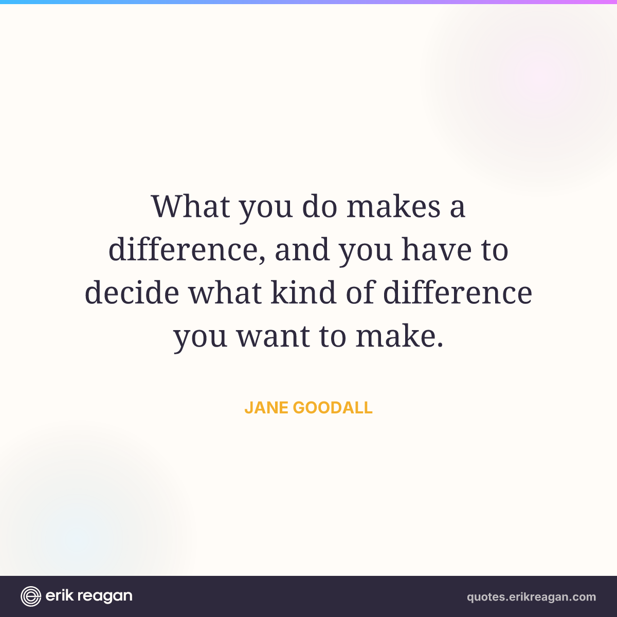 New New Random Quote | Share Post on X Share on Facebook Share on LinkedIn Send via Email | Copy Copy Quote Copy Link | Download Wide 1200×630 Square 1200×1200 Tall 900×1200 What you do makes a difference, and you have to decide what kind of difference you want to make.