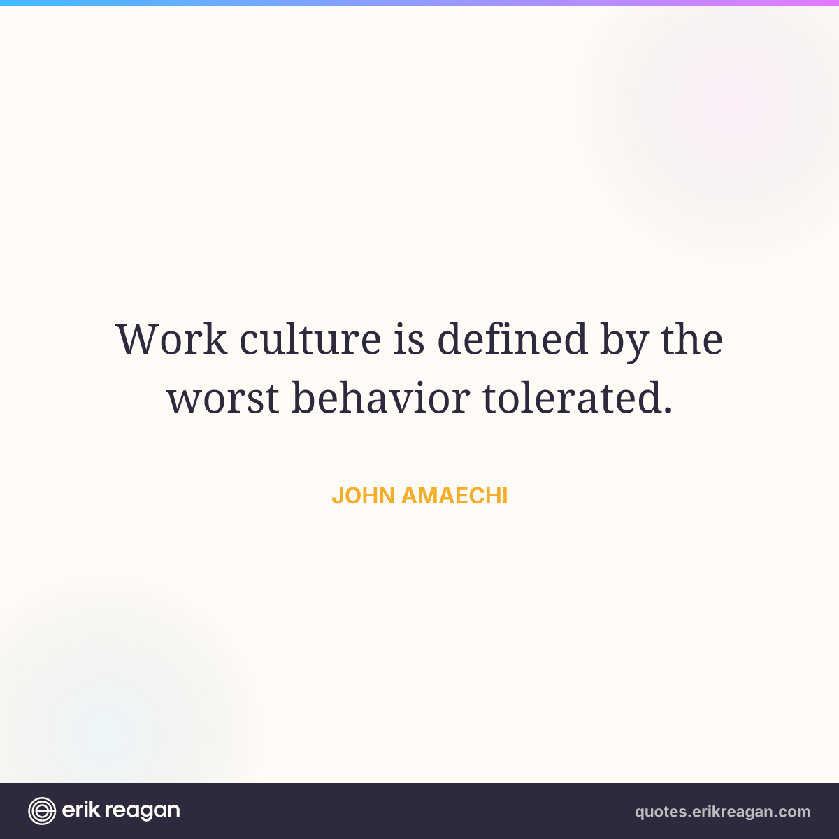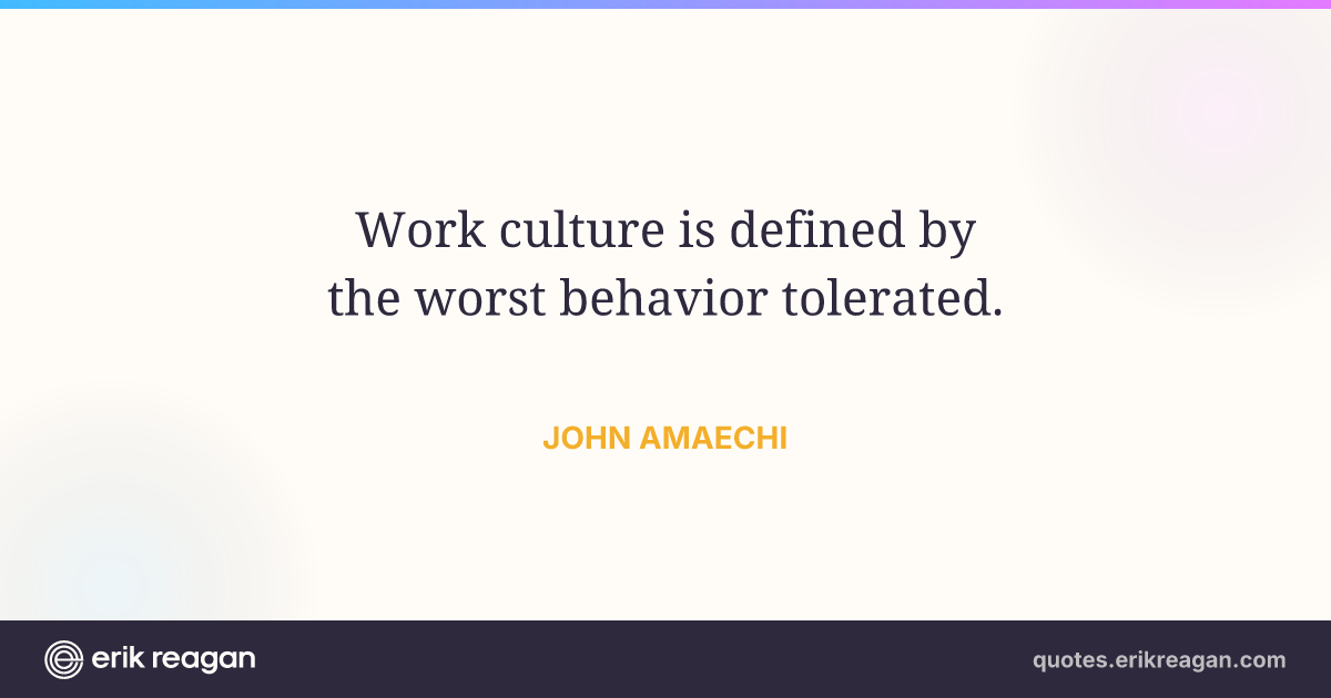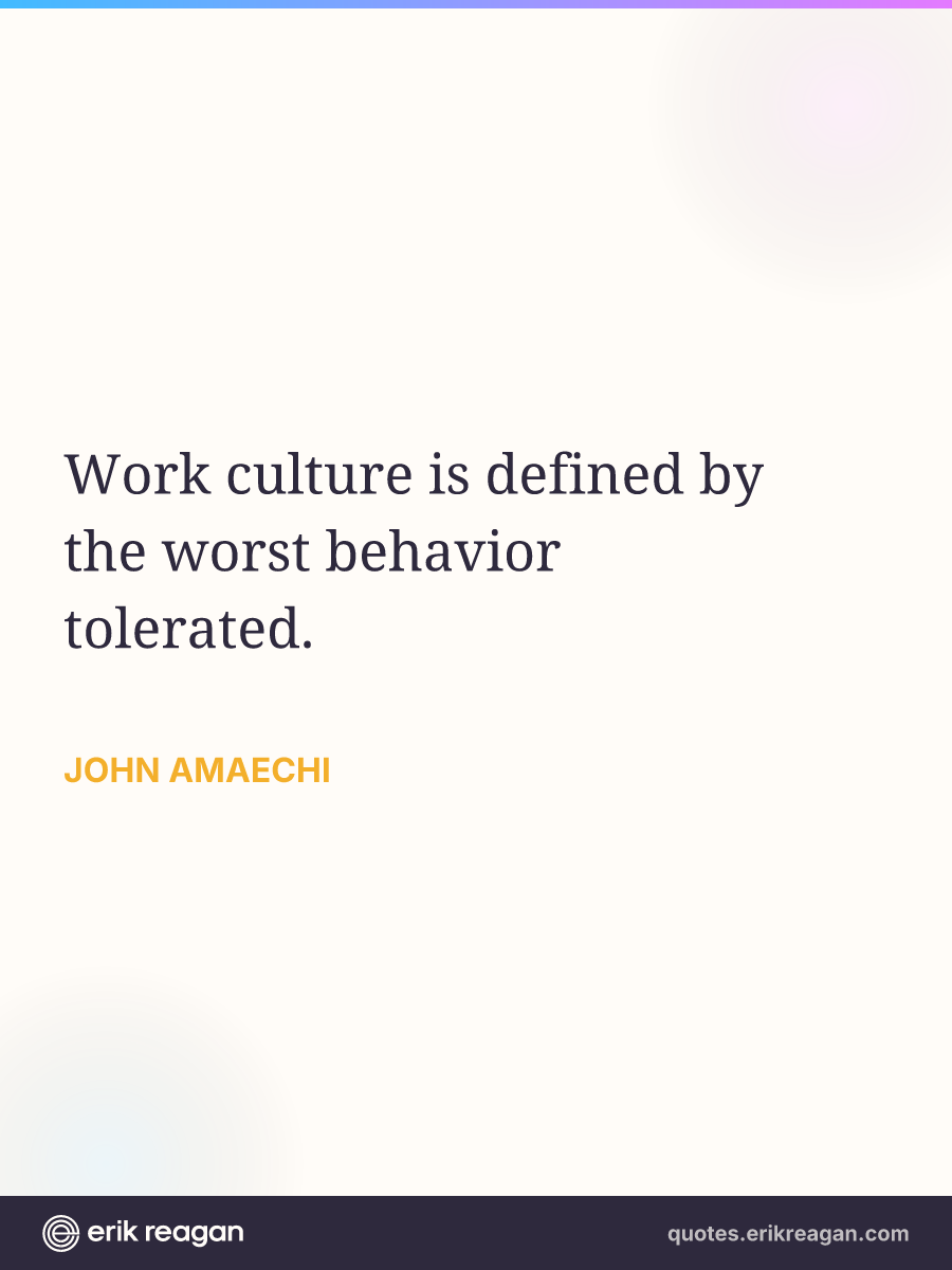 New New Random Quote | Share Post on X Share on Facebook Share on LinkedIn Send via Email | Copy Copy Quote Copy Link | Download Wide 1200×630 Square 1200×1200 Tall 900×1200 Work culture is defined by the worst behavior tolerated.