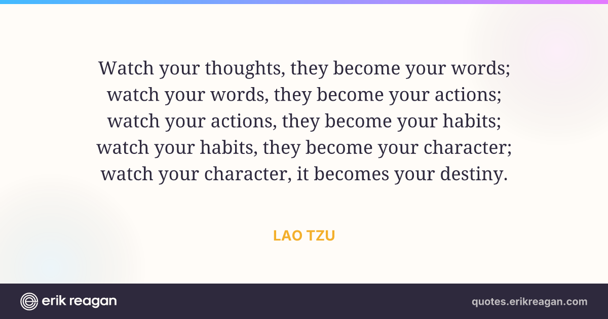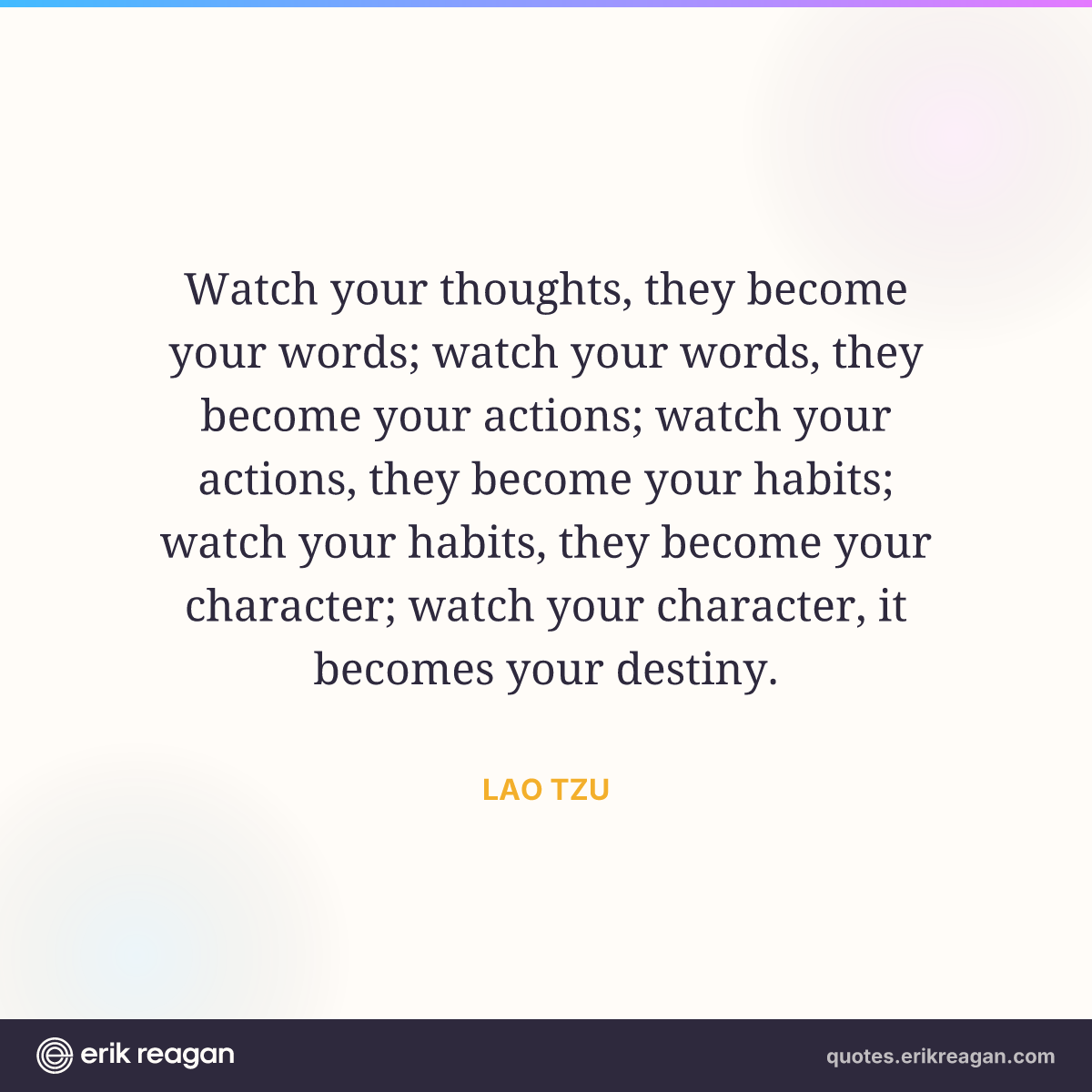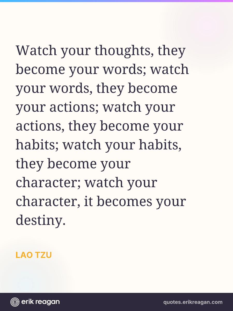 Watch your thoughts, they become your words; watch your words, they become your actions; watch your actions, they become your habits; watch your habits, they become your character; watch your character, it becomes your destiny.