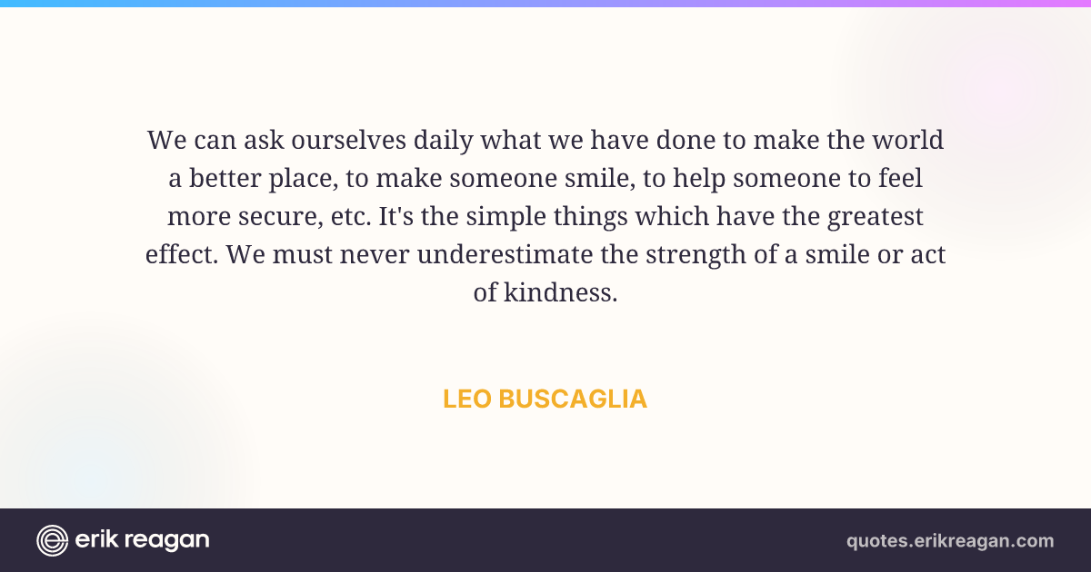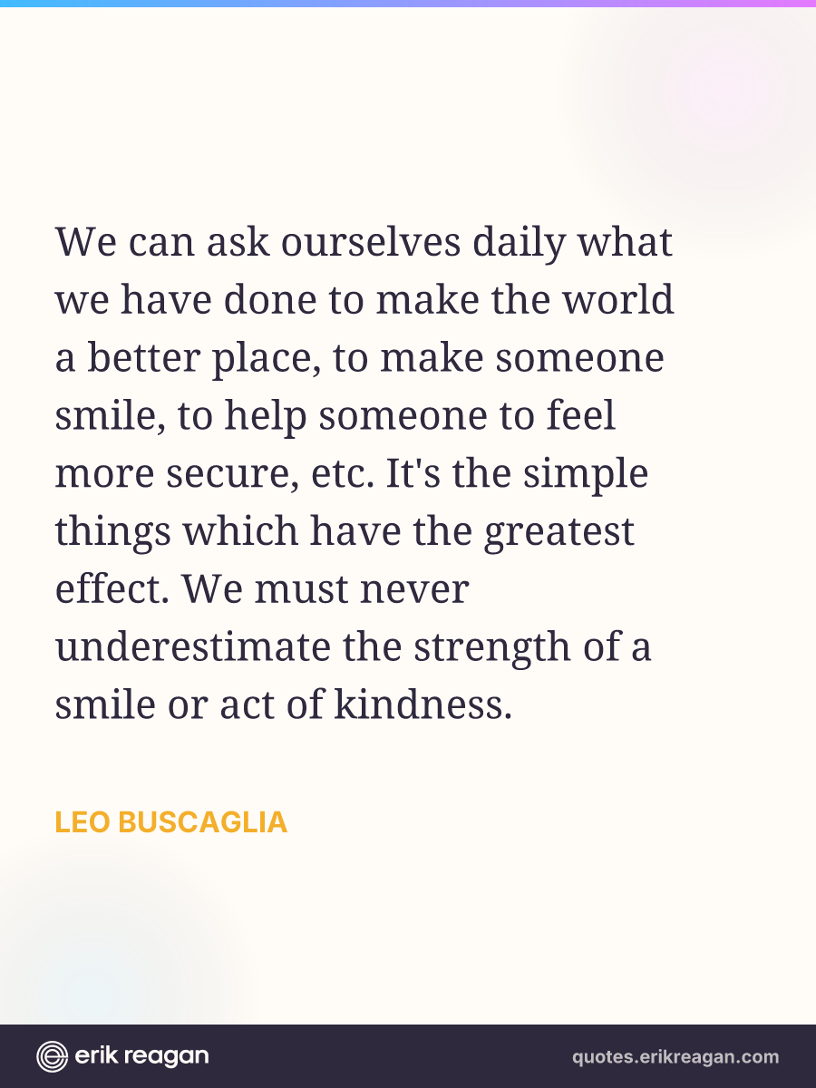 We can ask ourselves daily what we have done to make the world a better place, to make someone smile, to help someone to feel more secure, etc. It's the simple things which have the greatest effect. We must never underestimate the strength of a smile or act of kindness.
