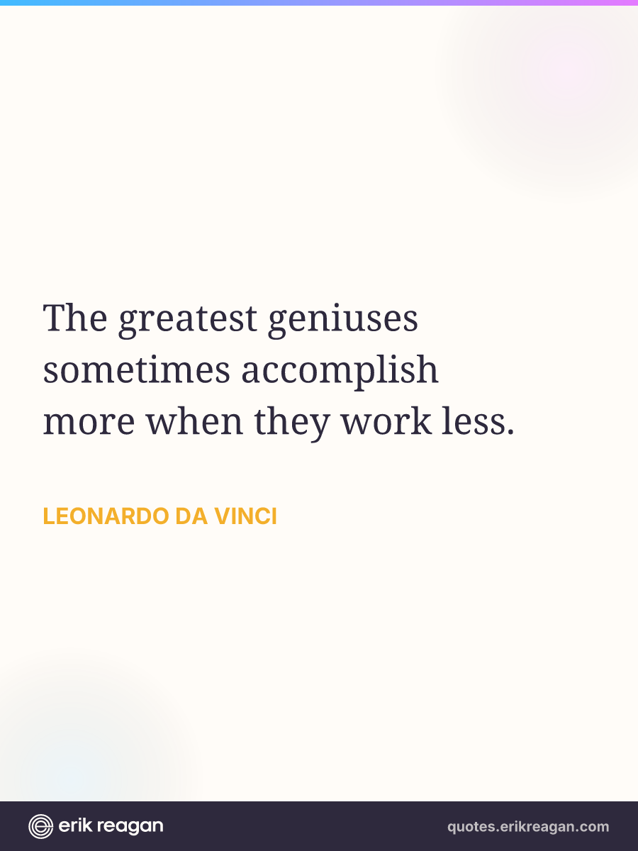 New New Random Quote | Share Post on X Share on Facebook Share on LinkedIn Send via Email | Copy Copy Quote Copy Link | Download Wide 1200×630 Square 1200×1200 Tall 900×1200 The greatest geniuses sometimes accomplish more when they work less.