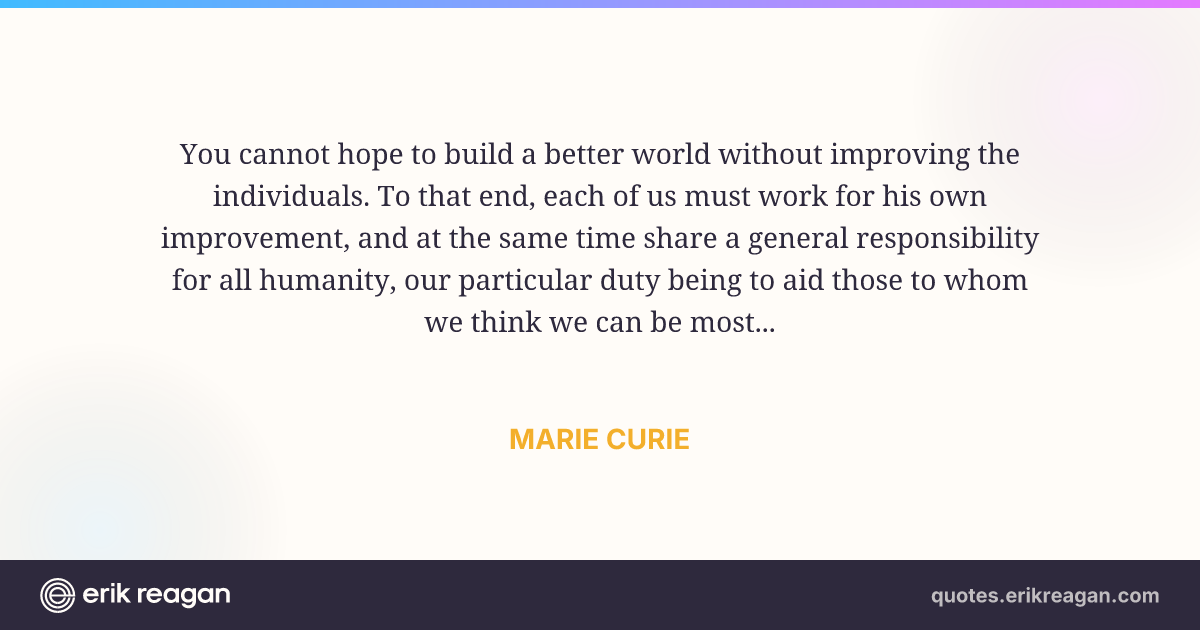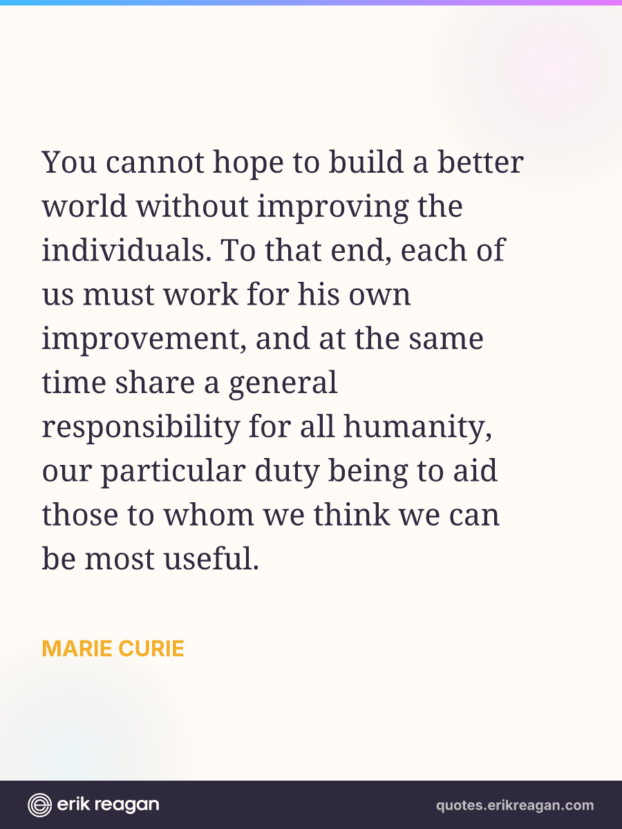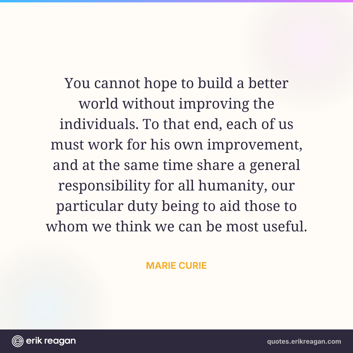 You cannot hope to build a better world without improving the individuals. To that end, each of us must work for his own improvement, and at the same time share a general responsibility for all humanity, our particular duty being to aid those to whom we think we can be most useful.
