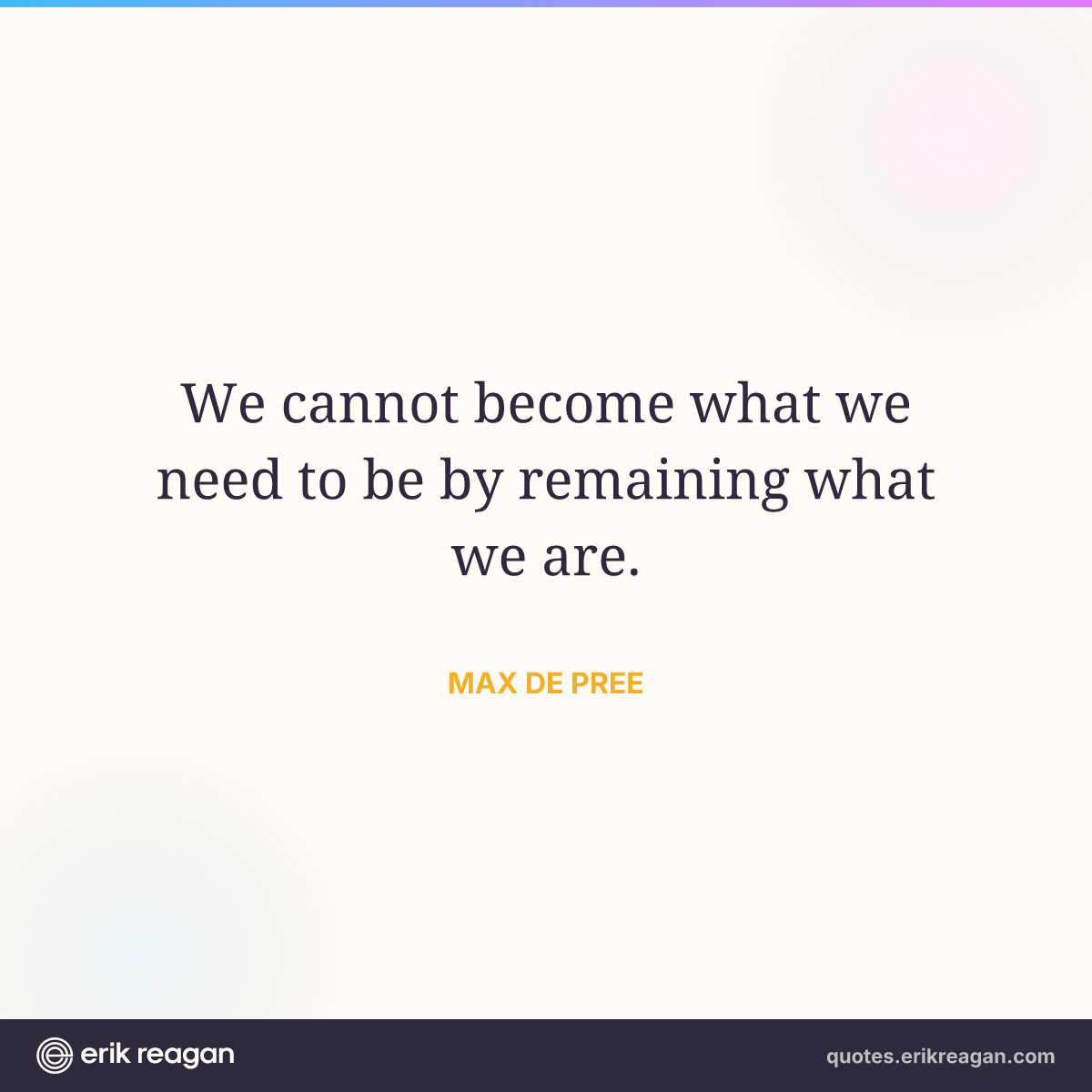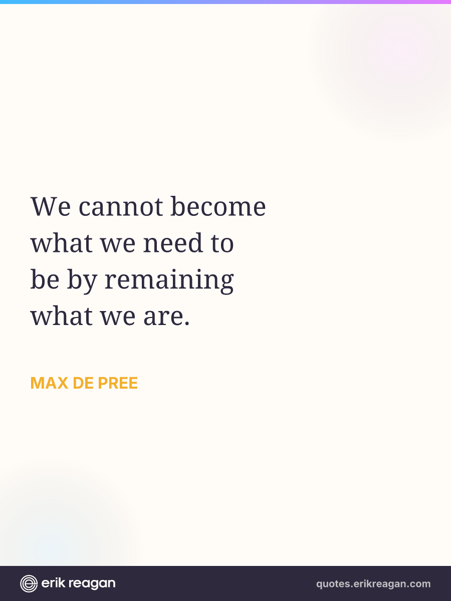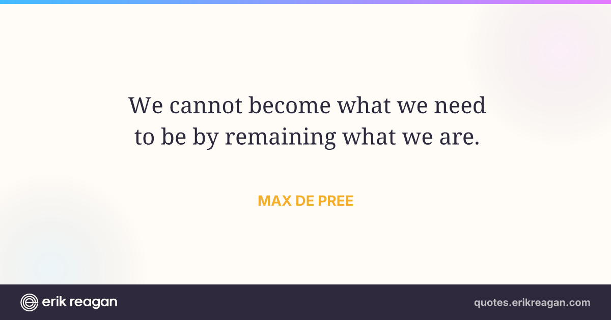 New New Random Quote | Share Post on X Share on Facebook Share on LinkedIn Send via Email | Copy Copy Quote Copy Link | Download Wide 1200×630 Square 1200×1200 Tall 900×1200 We cannot become what we need to be by remaining what we are.