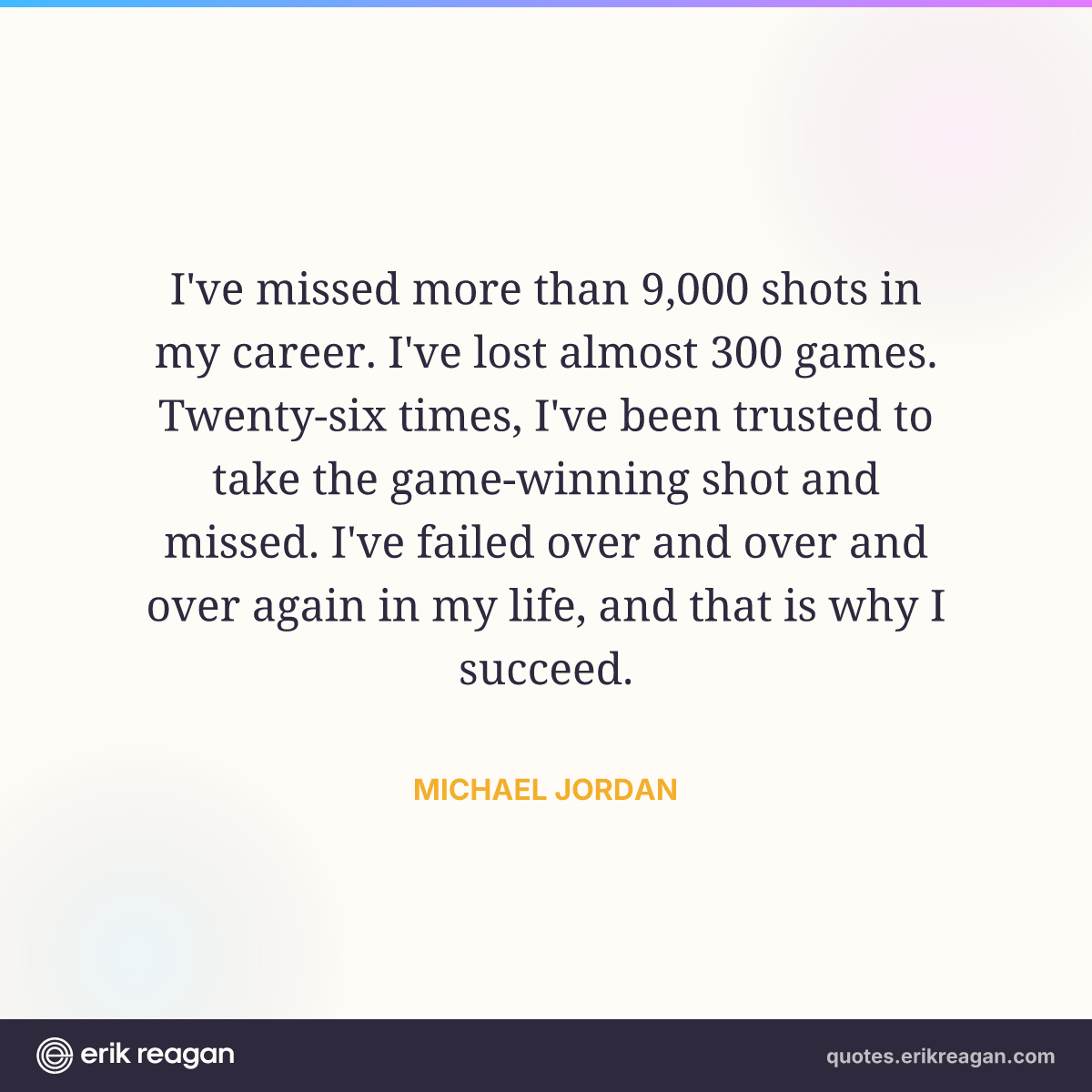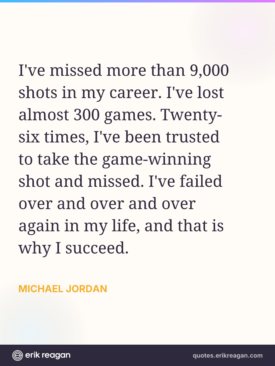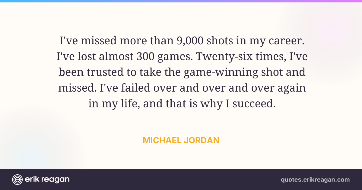 I've missed more than 9,000 shots in my career. I've lost almost 300 games. Twenty-six times, I've been trusted to take the game-winning shot and missed. I've failed over and over and over again in my life, and that is why I succeed.