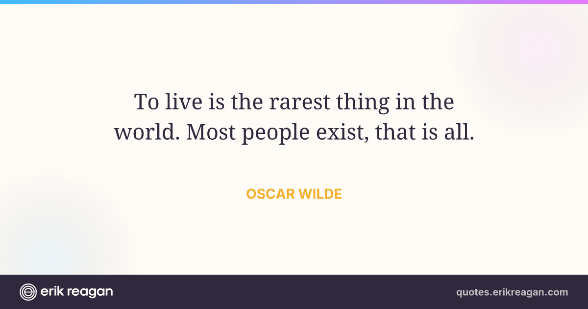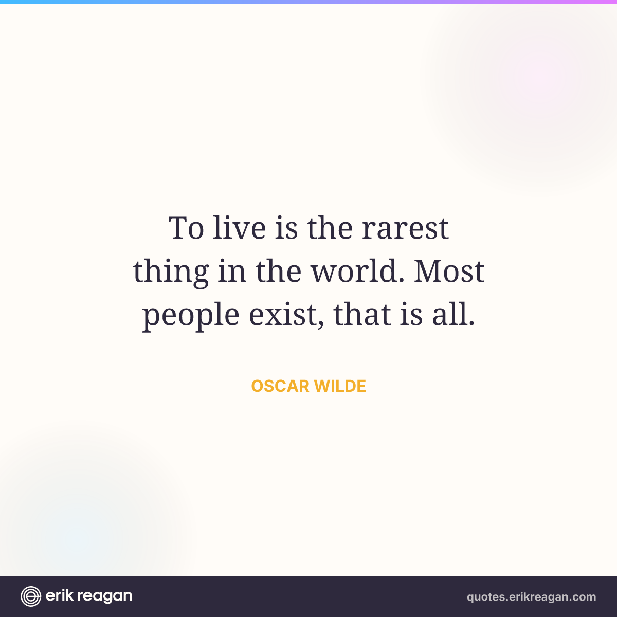 New New Random Quote | Share Post on X Share on Facebook Share on LinkedIn Send via Email | Copy Copy Quote Copy Link | Download Wide 1200×630 Square 1200×1200 Tall 900×1200 To live is the rarest thing in the world. Most people exist, that is all.