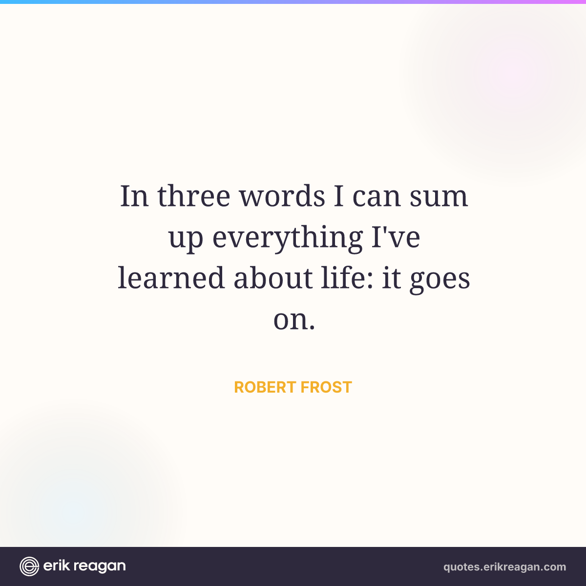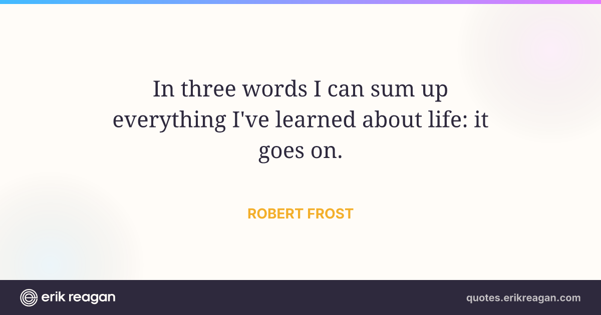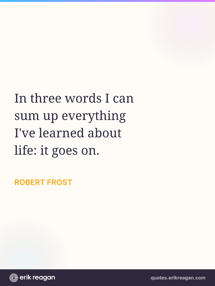 New New Random Quote | Share Post on X Share on Facebook Share on LinkedIn Send via Email | Copy Copy Quote Copy Link | Download Wide 1200×630 Square 1200×1200 Tall 900×1200 In three words I can sum up everything I've learned about life: it goes on.