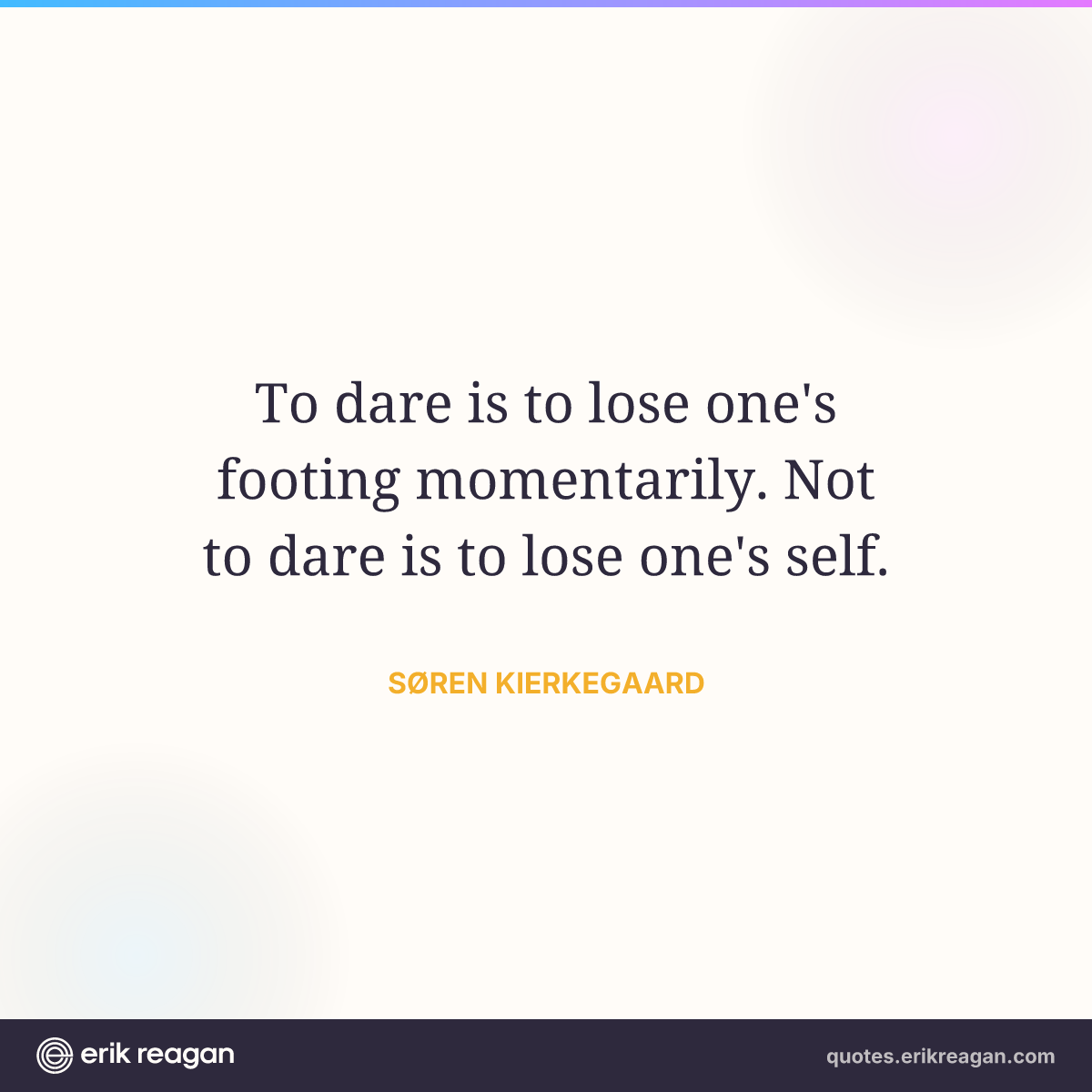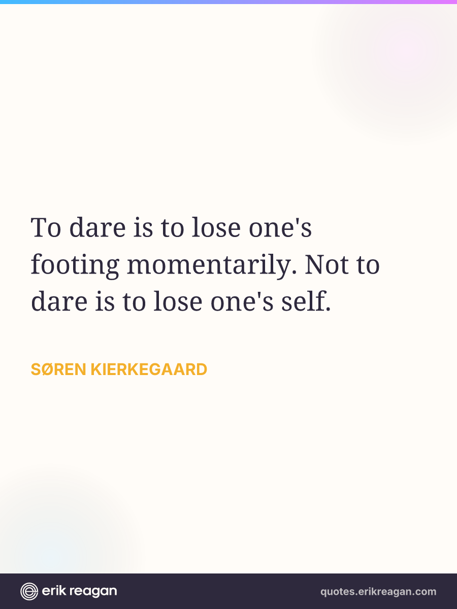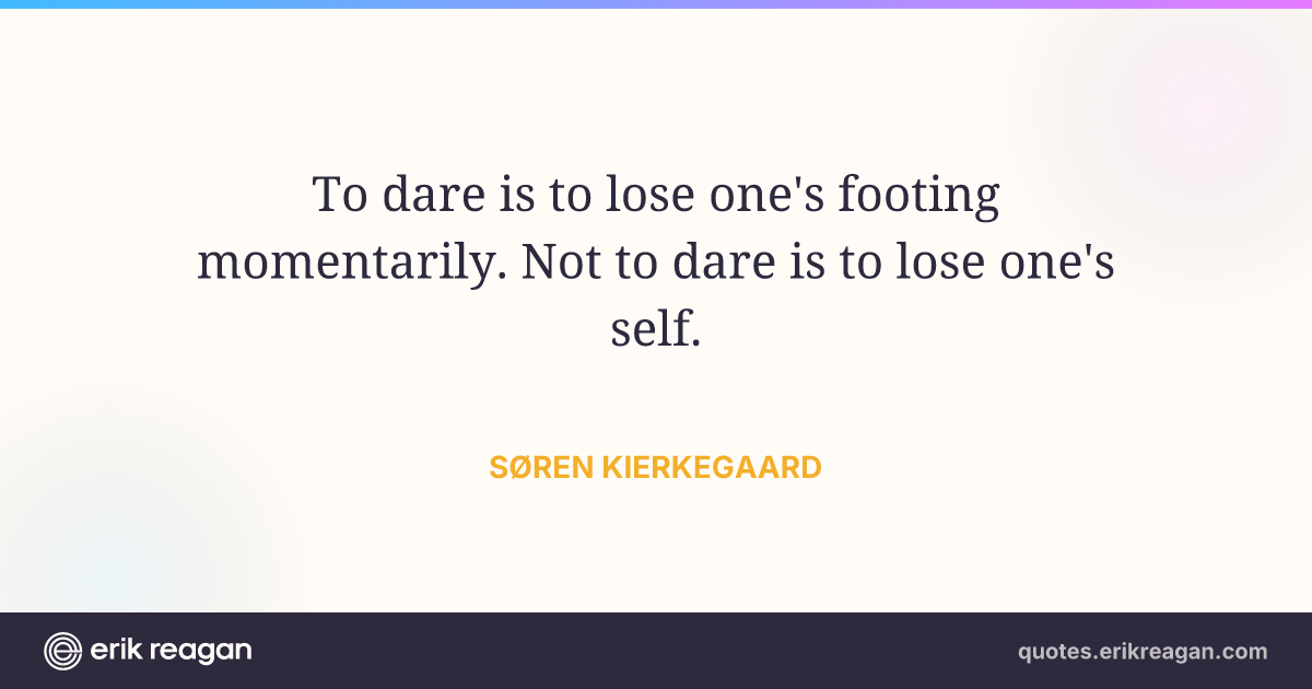 New New Random Quote | Share Post on X Share on Facebook Share on LinkedIn Send via Email | Copy Copy Quote Copy Link | Download Wide 1200×630 Square 1200×1200 Tall 900×1200 To dare is to lose one's footing momentarily. Not to dare is to lose one's self.