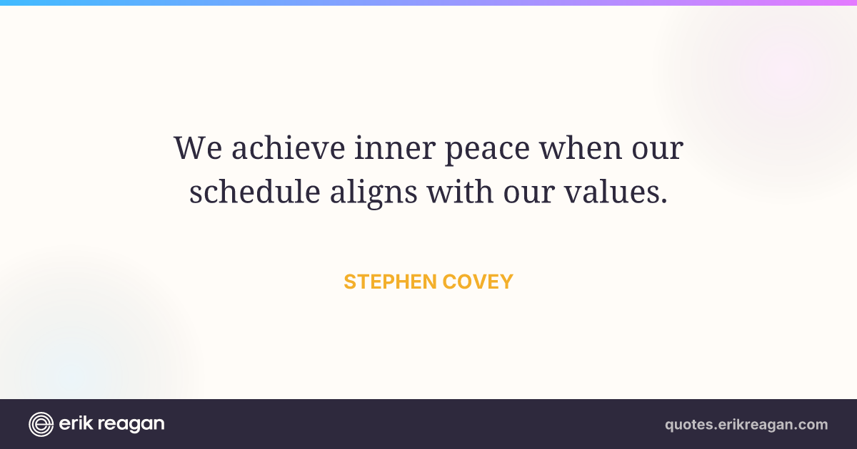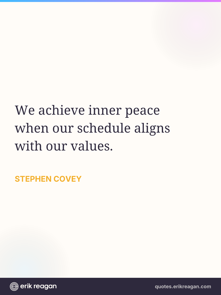 New New Random Quote | Share Post on X Share on Facebook Share on LinkedIn Send via Email | Copy Copy Quote Copy Link | Download Wide 1200×630 Square 1200×1200 Tall 900×1200 We achieve inner peace when our schedule aligns with our values.