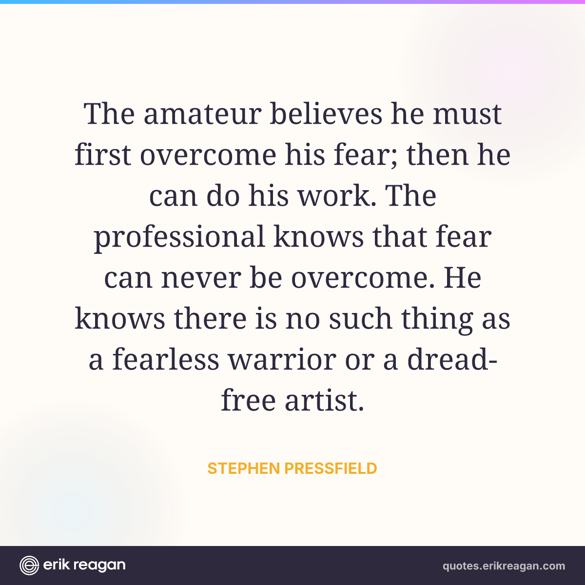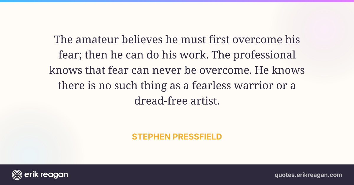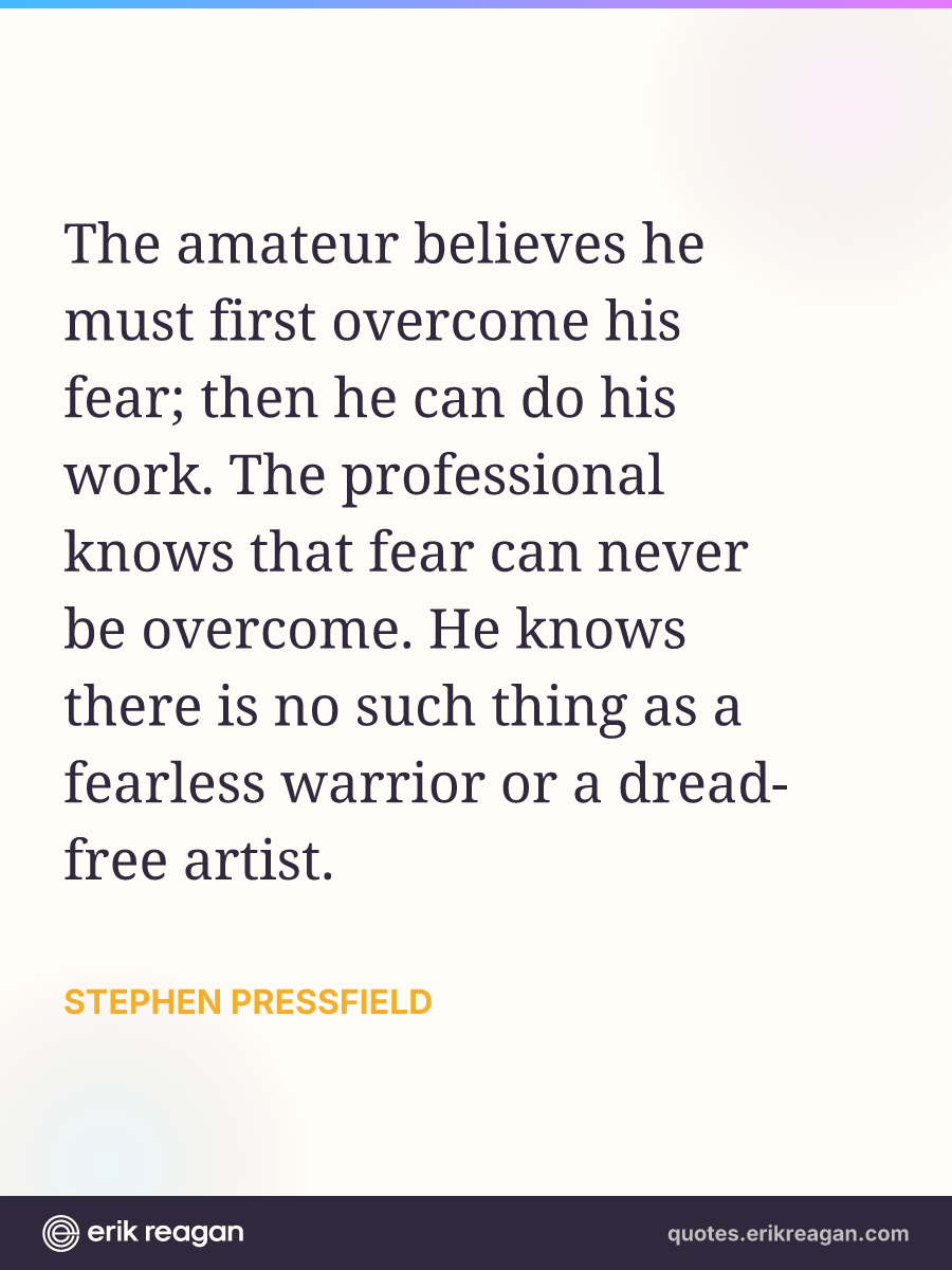 The amateur believes he must first overcome his fear; then he can do his work. The professional knows that fear can never be overcome. He knows there is no such thing as a fearless warrior or a dread-free artist.