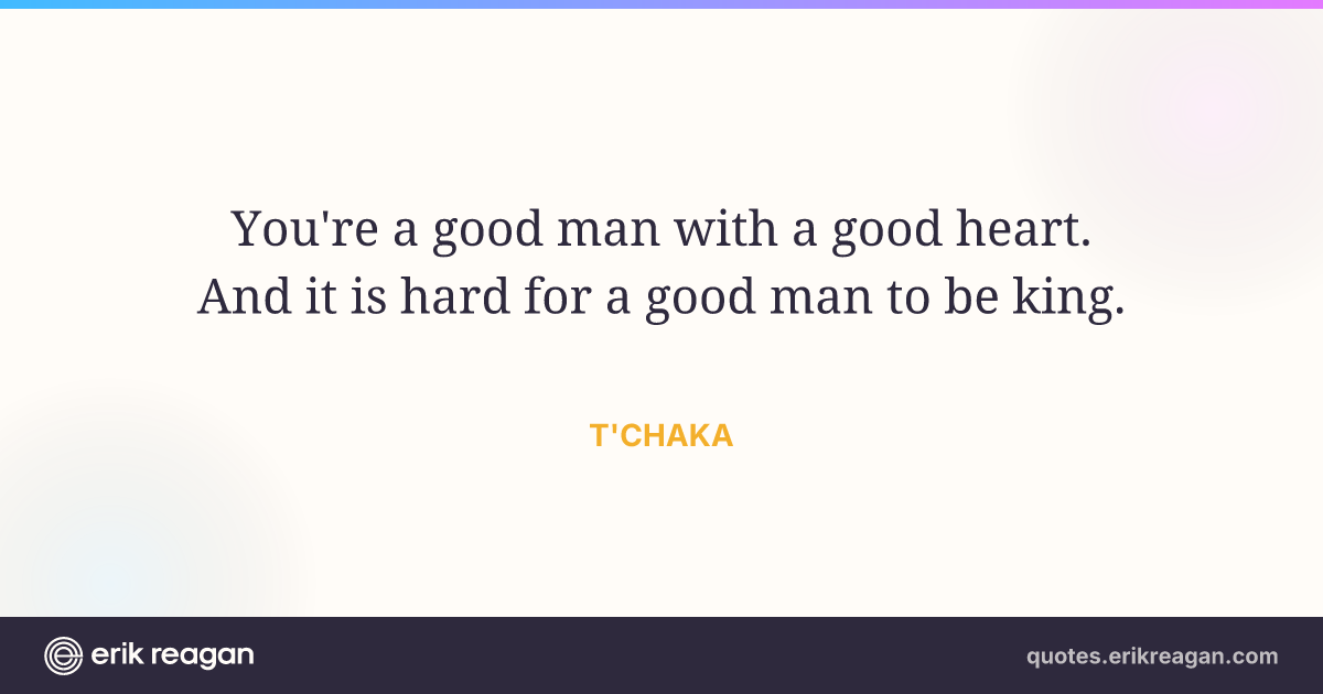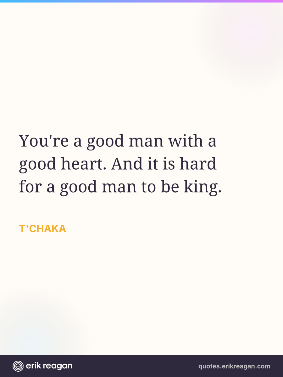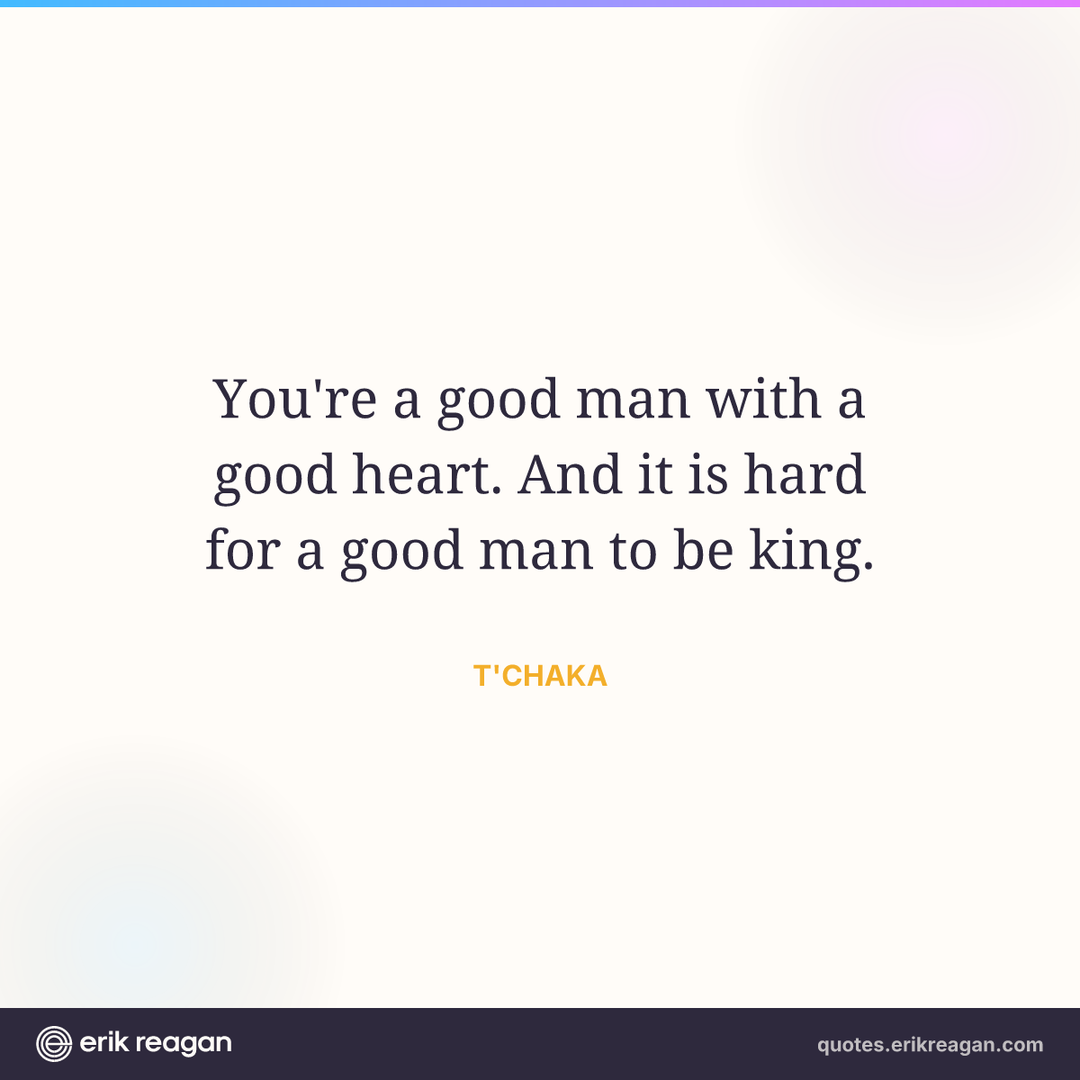 New New Random Quote | Share Post on X Share on Facebook Share on LinkedIn Send via Email | Copy Copy Quote Copy Link | Download Wide 1200×630 Square 1200×1200 Tall 900×1200 You're a good man with a good heart. And it is hard for a good man to be king.