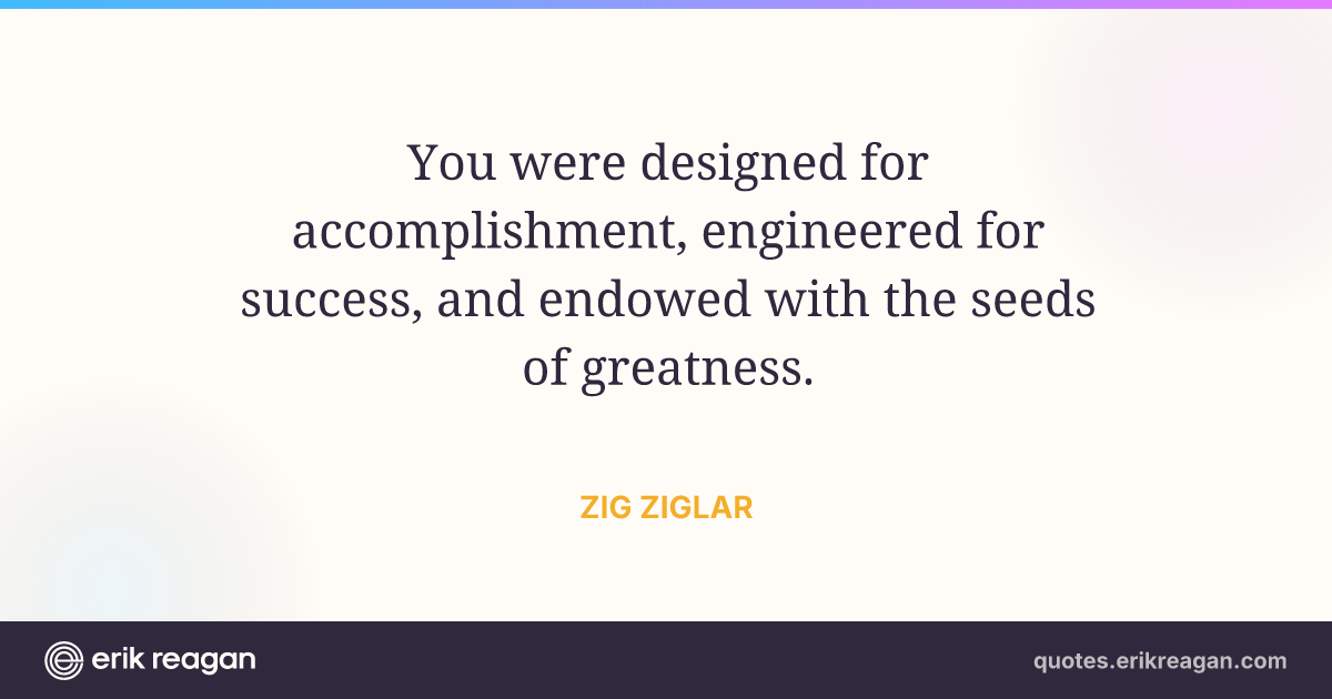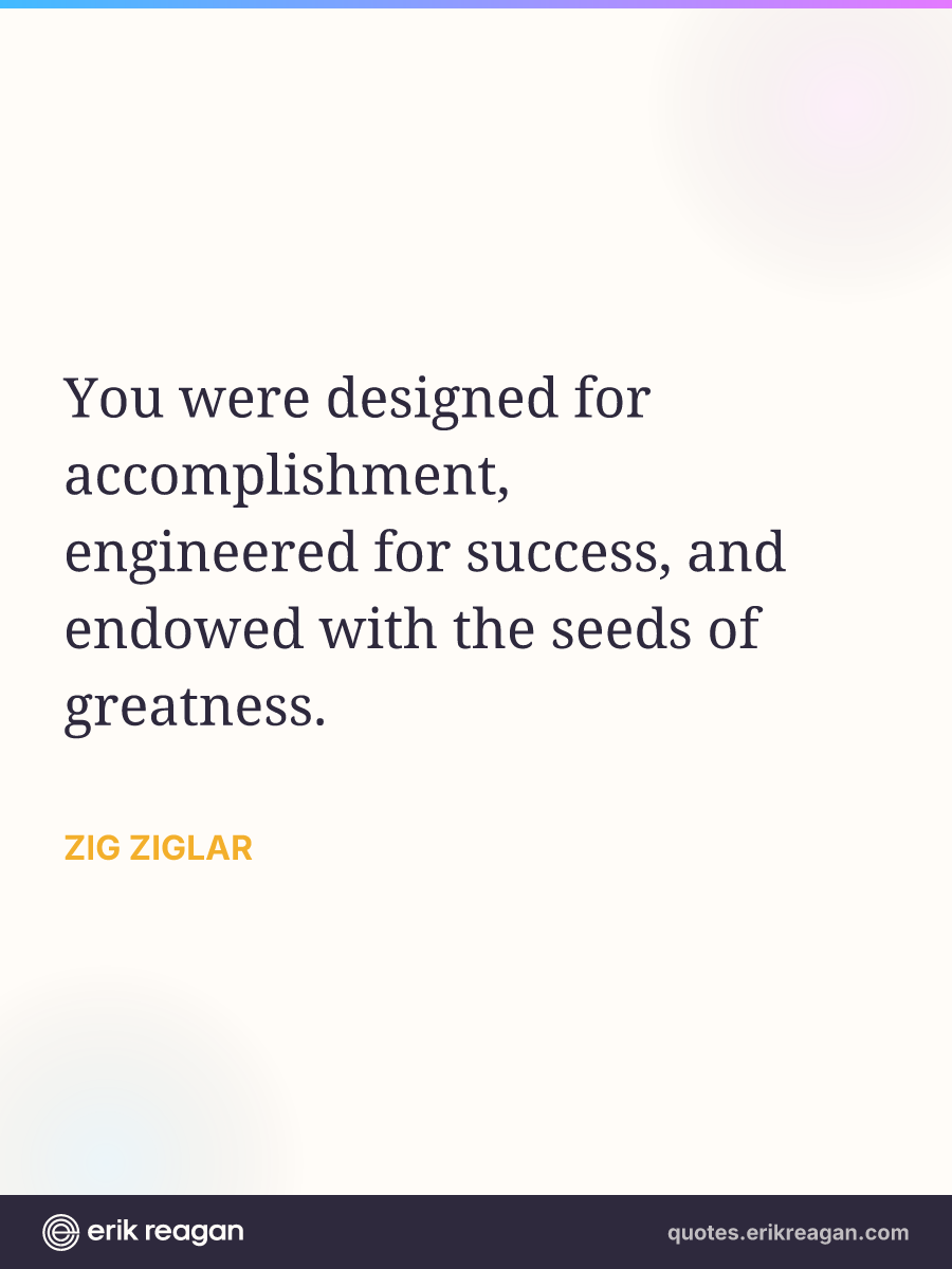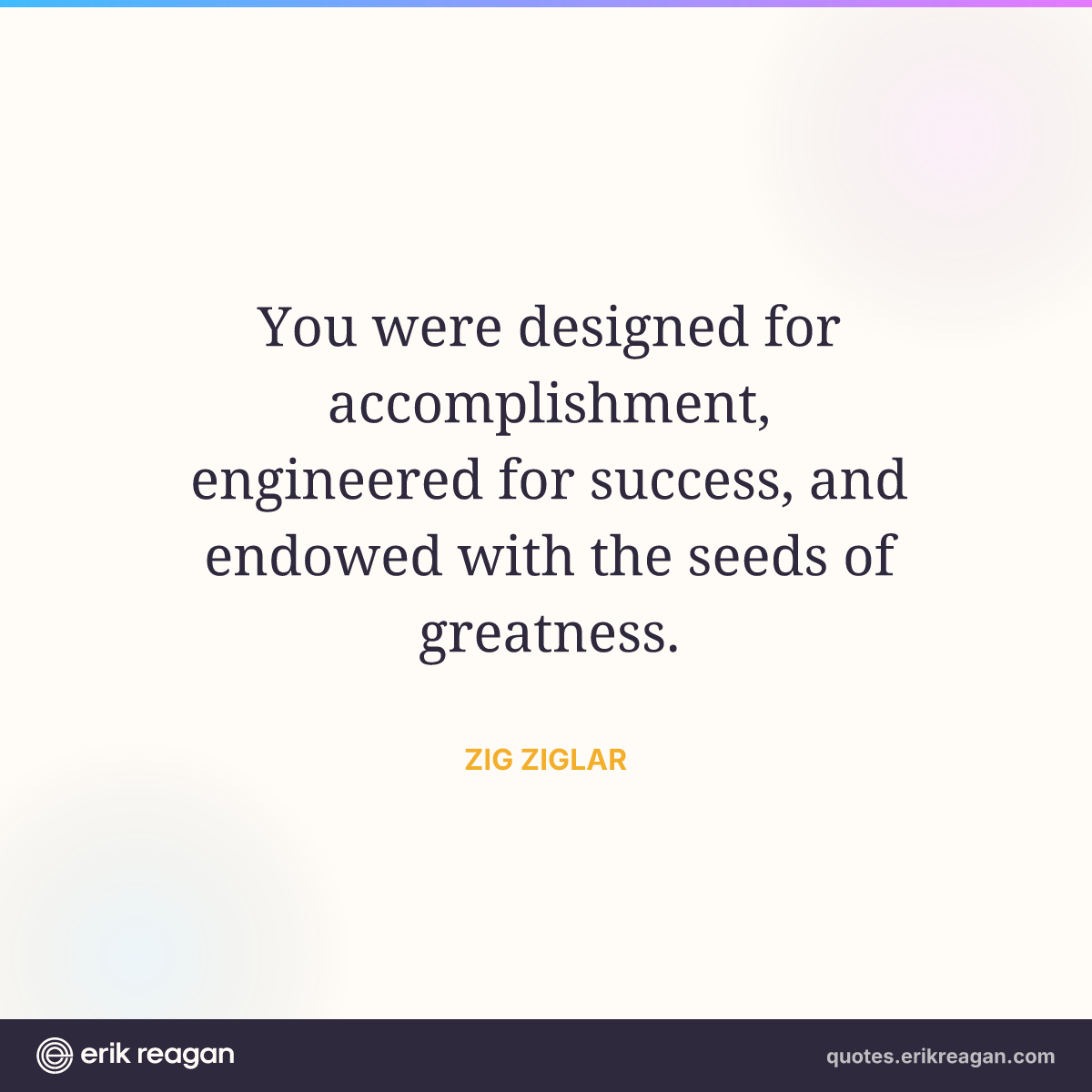 New New Random Quote | Share Post on X Share on Facebook Share on LinkedIn Send via Email | Copy Copy Quote Copy Link | Download Wide 1200×630 Square 1200×1200 Tall 900×1200 You were designed for accomplishment, engineered for success, and endowed with the seeds of greatness.