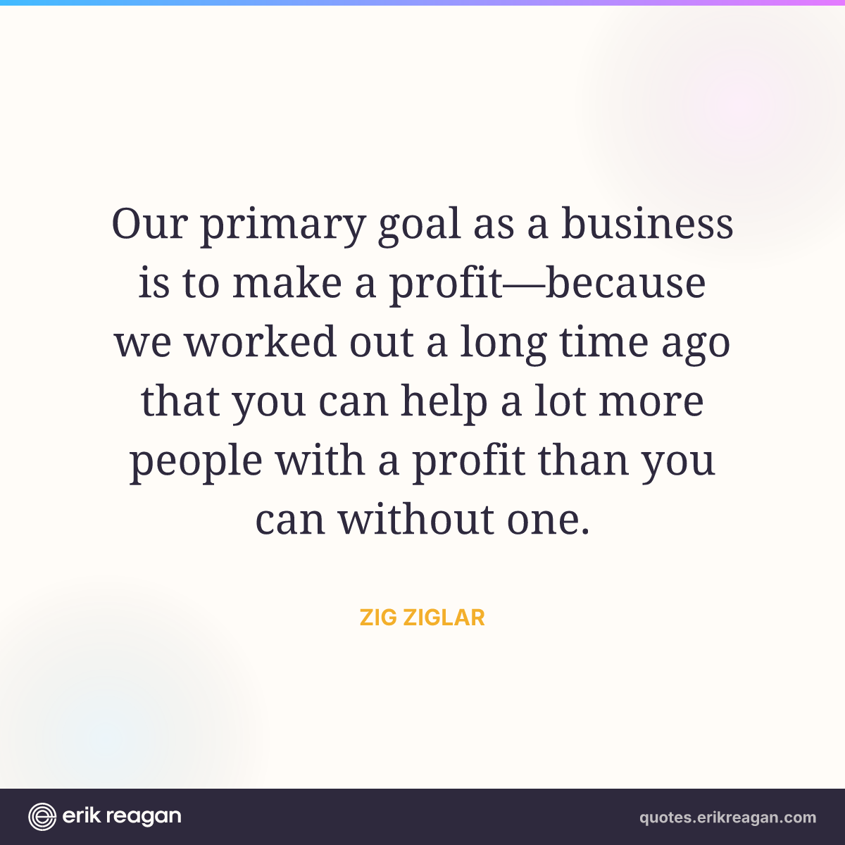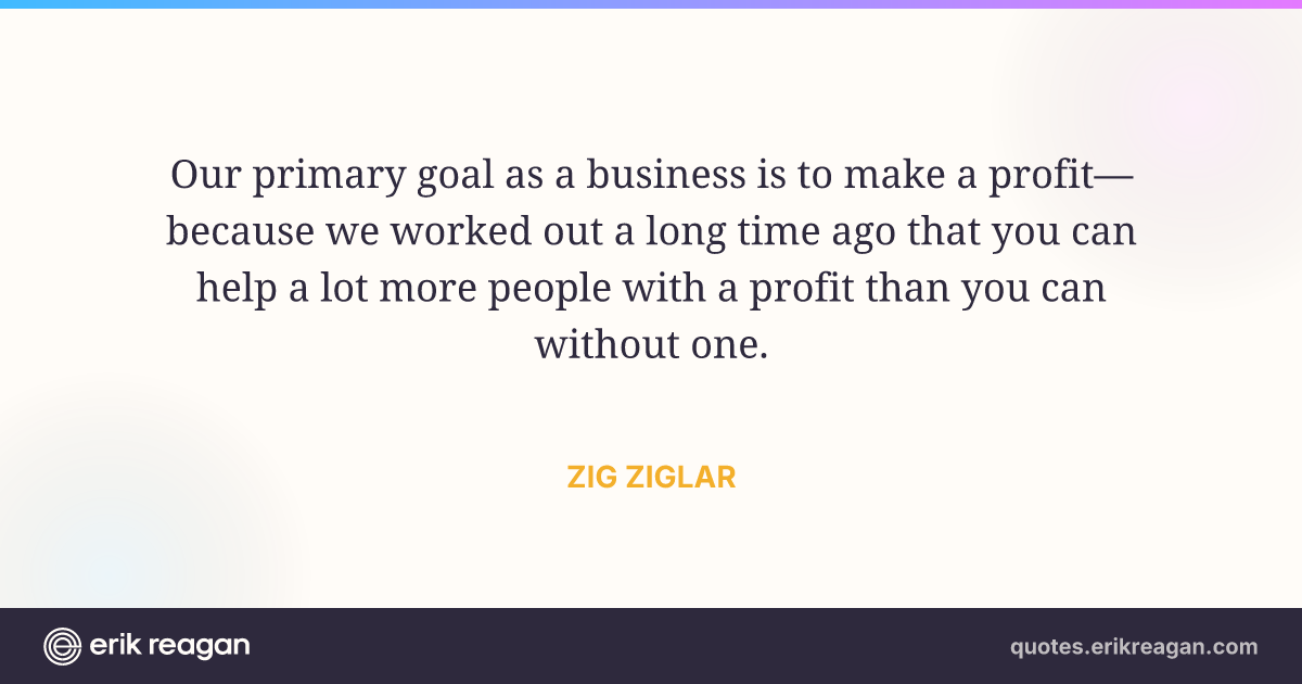New New Random Quote | Share Post on X Share on Facebook Share on LinkedIn Send via Email | Copy Copy Quote Copy Link | Download Wide 1200×630 Square 1200×1200 Tall 900×1200 Our primary goal as a business is to make a profit—because we worked out a long time ago that you can help a lot more people with a profit than you can without one.